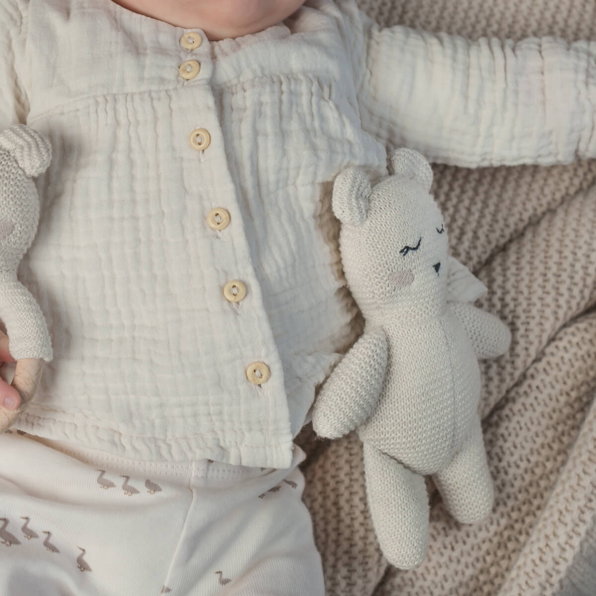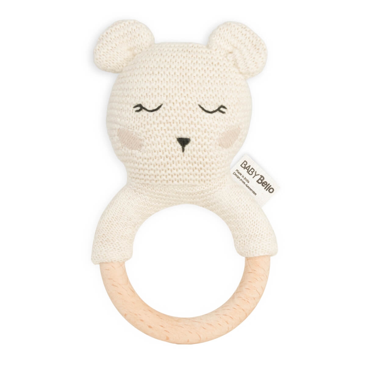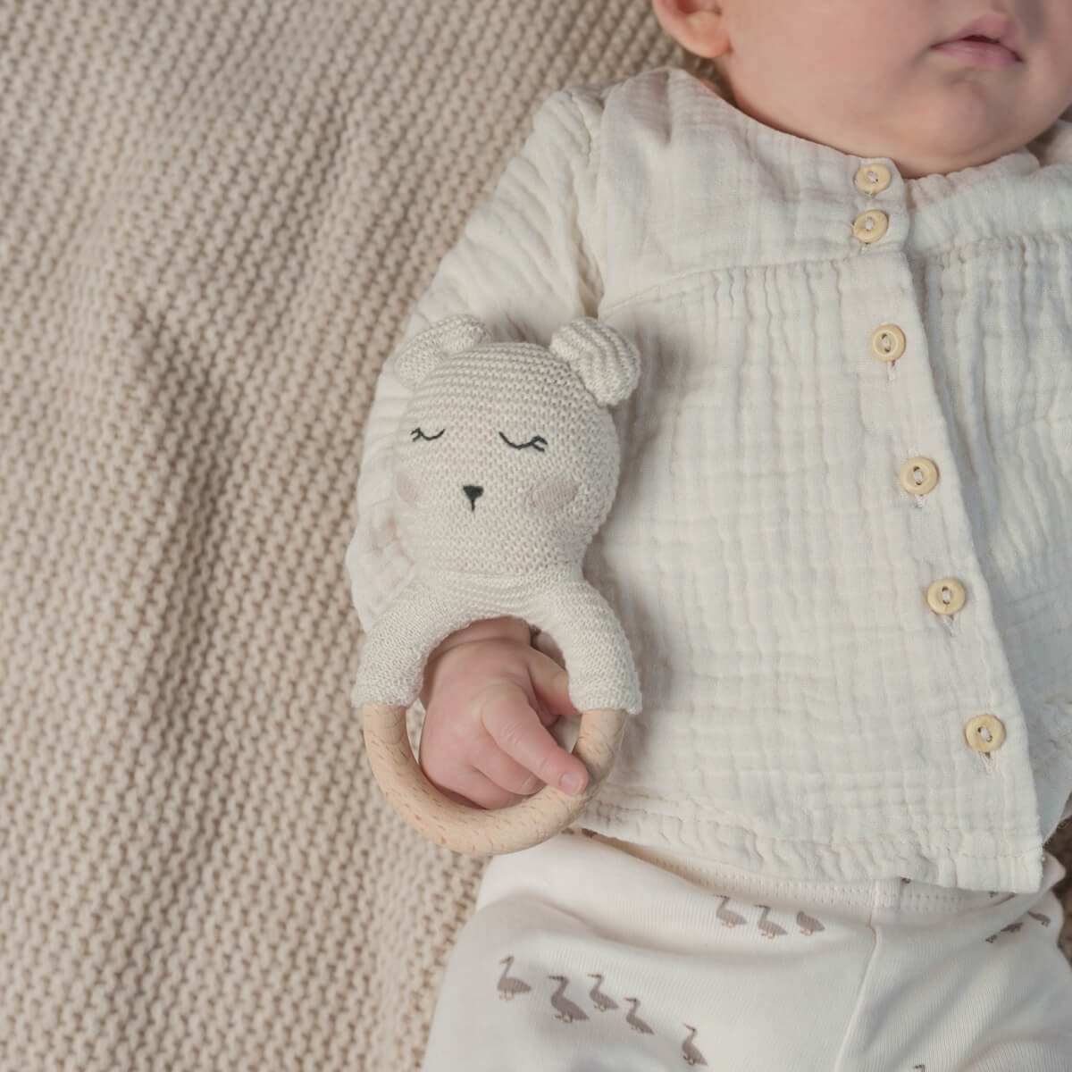 Der Greifling besteht aus GOTS-zertifizierter Bio-Baumwolle mit einer Füllung aus recyceltem Polyester und einem Ring aus FSC-zertifiziertem Birkenholz.