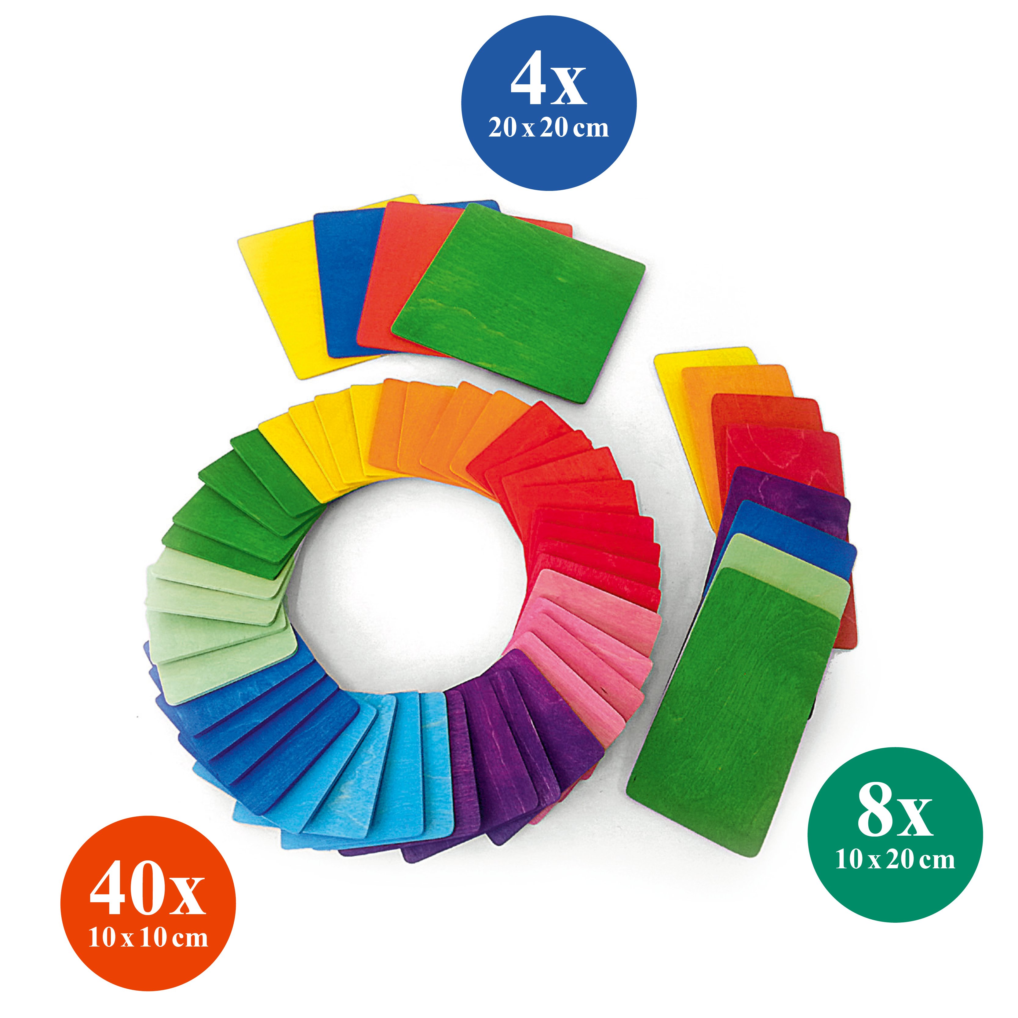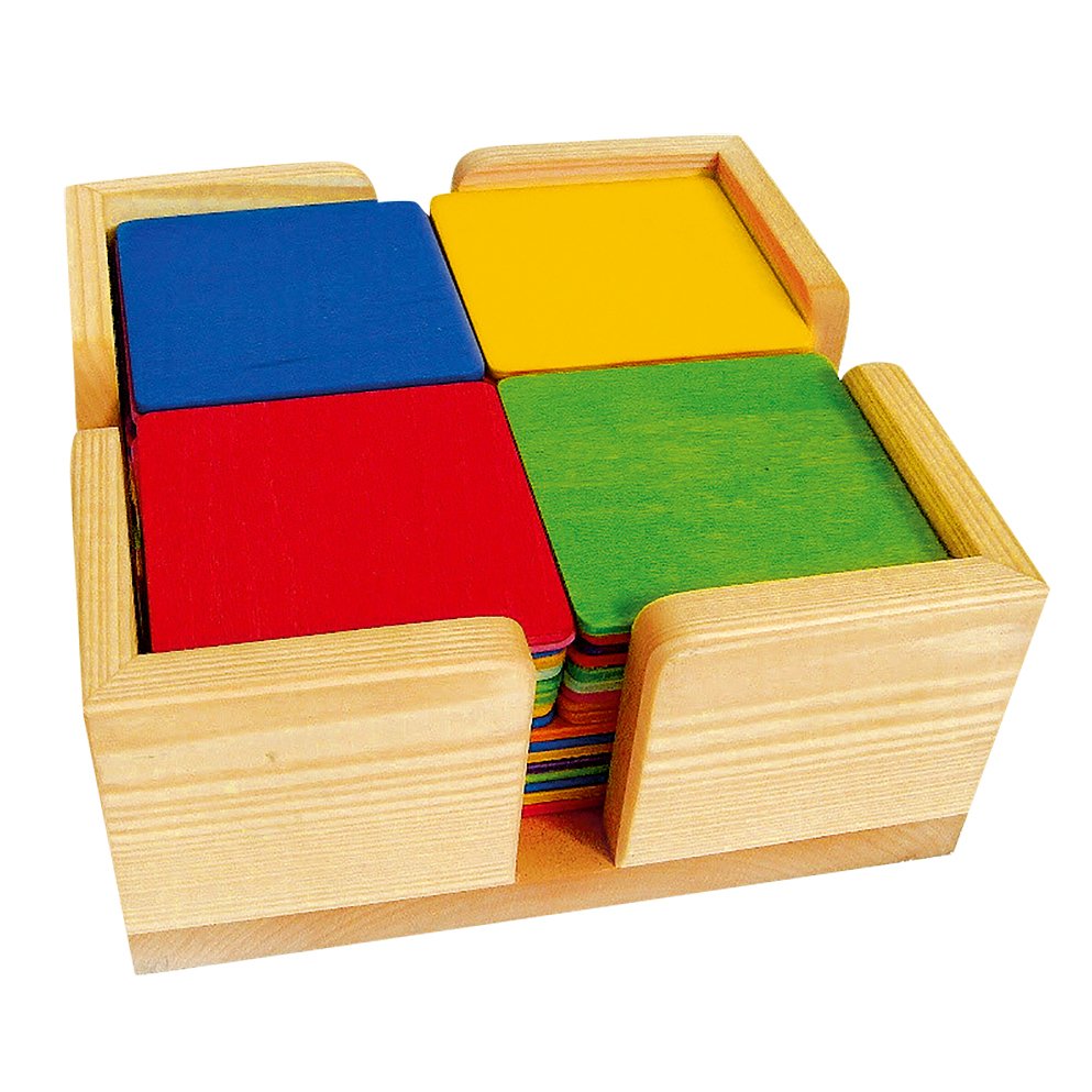 Dieses bunte Set besteht aus 52 Bauplatten in 10 Farben und drei verschiedenen Größen in einem Holzkasten.