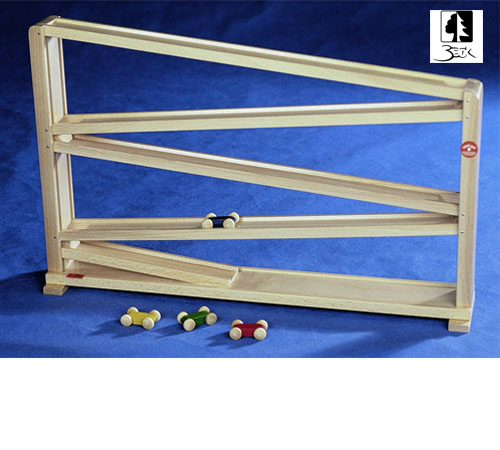 Eine sehr schöne, große, stabile, naturlackierte, Laufbahn aus Buchenholz von Beck-Holzspielzeug. Zu dieser Bahn gehören 4 bunte Autos, die in der Spur hinabsausen.