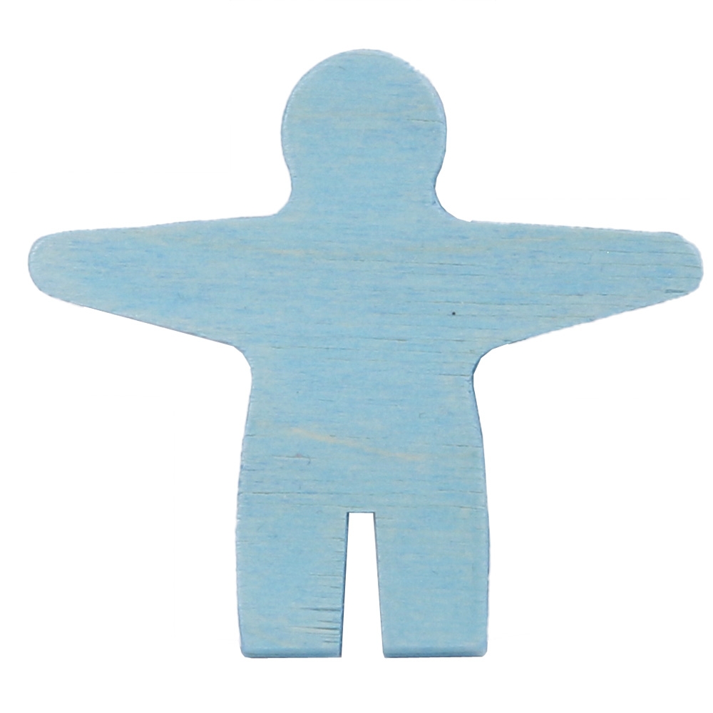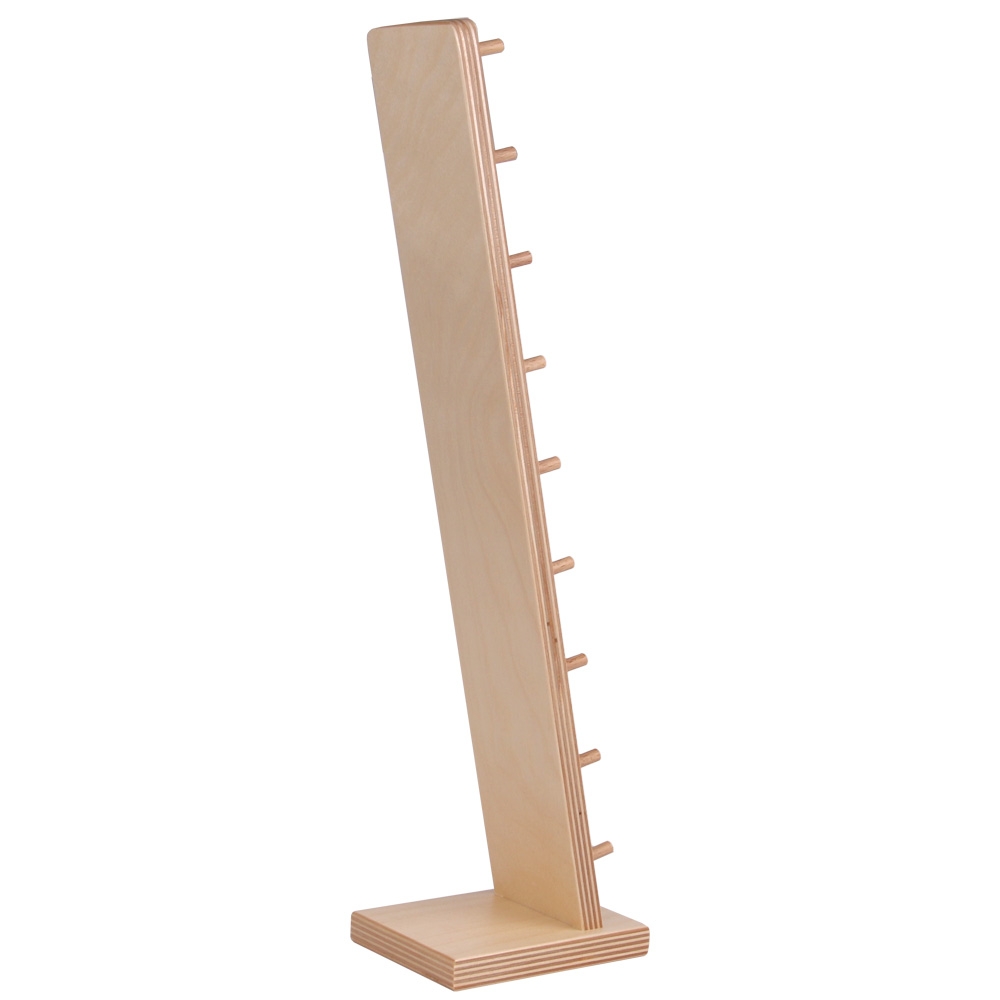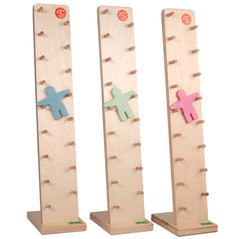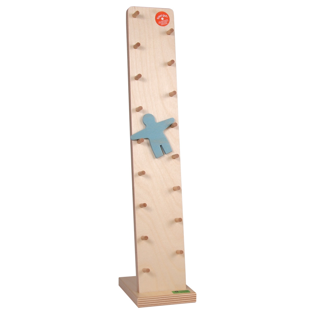 Ein Klabastermännchen aus Birkensperrholz von Beck-Holzspielzeug. Der Turm ist naturlackiert mit Steckern, an denen das hellblaue Männchen herabklettert. Er hat einen Fuß zum Aufstellen.
