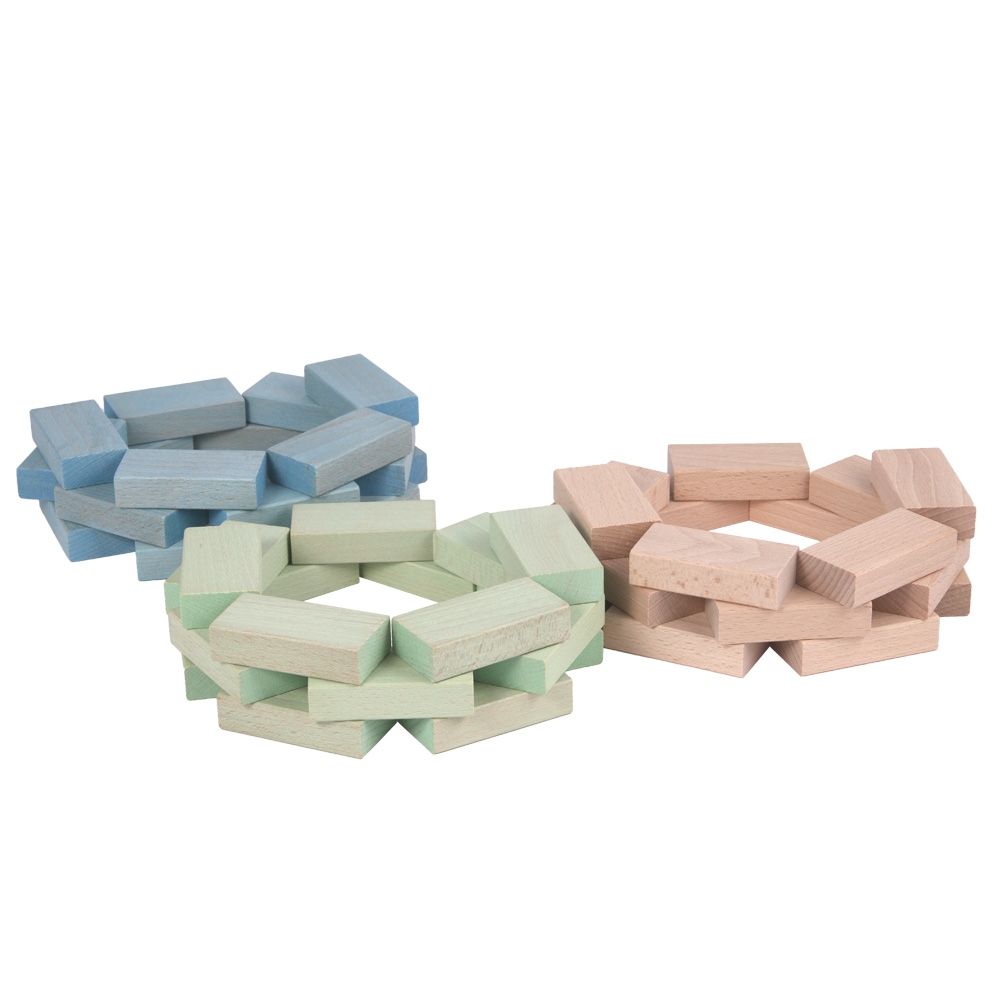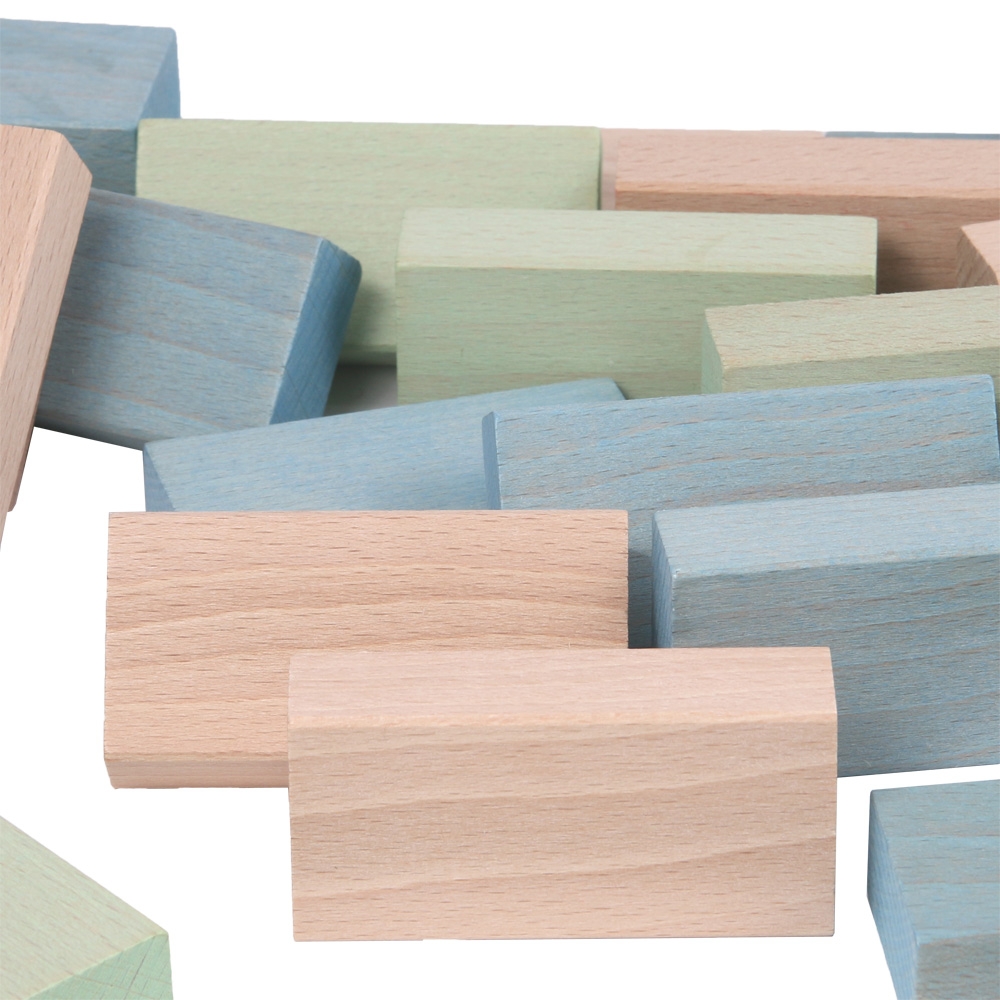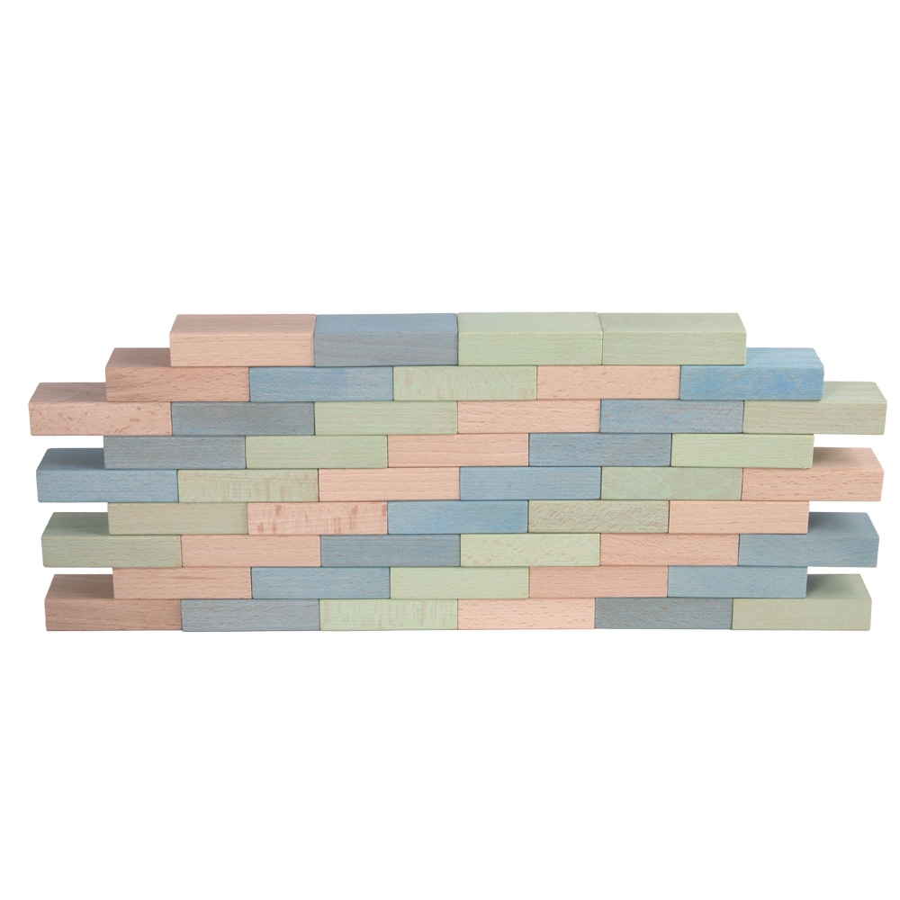 Ein Set aus 48 Uhlbausteinen aus Buchenholz in blau, grün und natur mit einem Grundmaß von 70 x 35 x 17,5 mm.