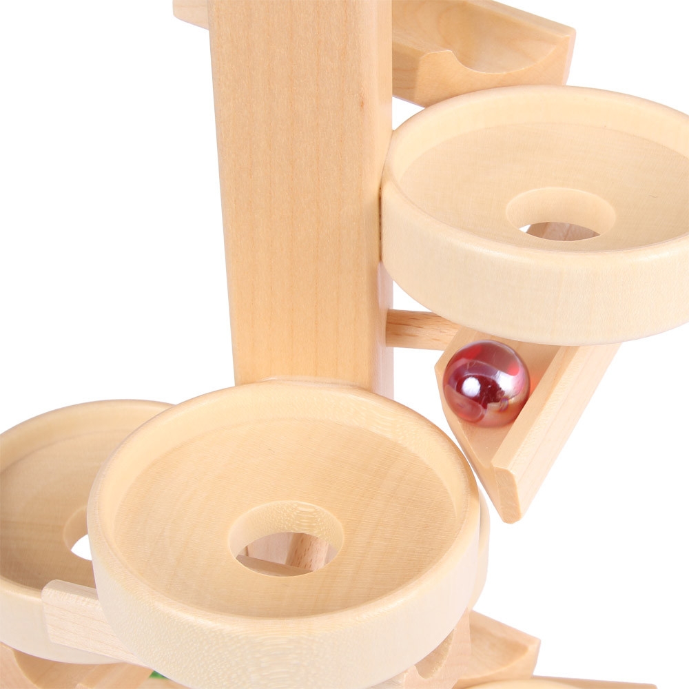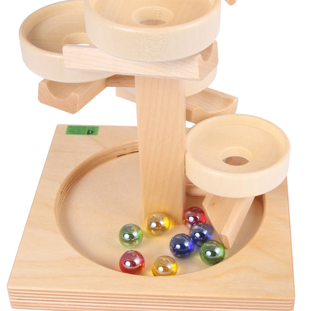Der naturfarbene Tellerturm ist eine faszinierende Kugelbahn in einem ausgesprochen schönen Design von Beck-Holzspielzeug.
