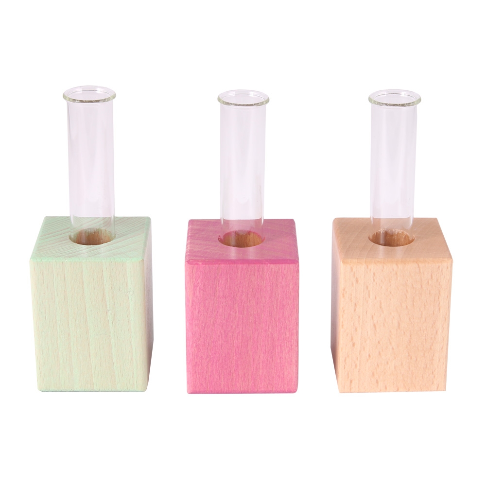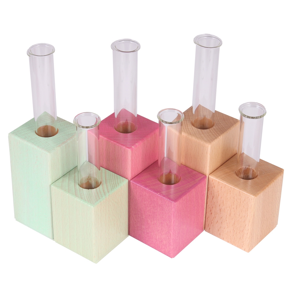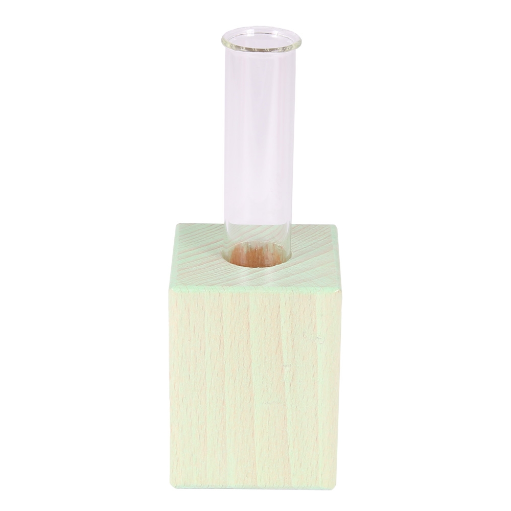 Eine hübsche Blumenvase von Beck Holzspielzeug aus pastellgrün gebeiztem Buchenholz mit eingesetztem Reagenzglas, die im Nu zu einem hübschen Hingucker wird.