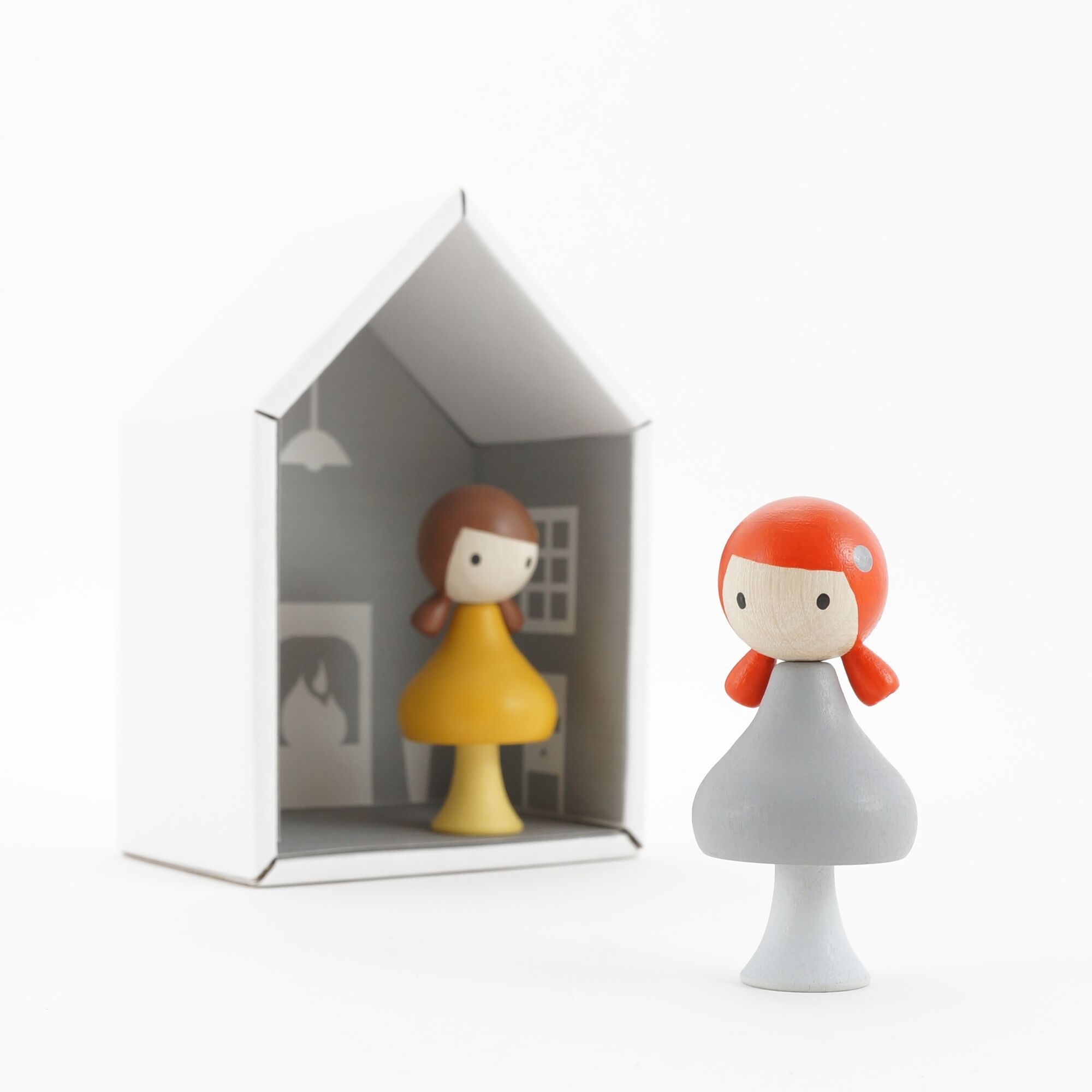 Geliefert werden die Püppchen in einem kleinen stabilen Karton in der Form eines Hauses, das mit ins Spiel integriert werden kann.