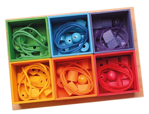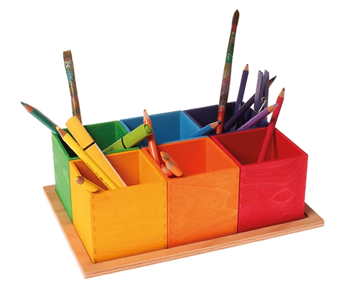 In die sechs Kisten der kleinen Sortierhilfe von GRIMM´S lassen sich wunderbar die Holzperlen zum Fädeln aufbewahren. Aber auch als Schreibtisch-Utensil machen die bunten Kisten eine gute Figur.