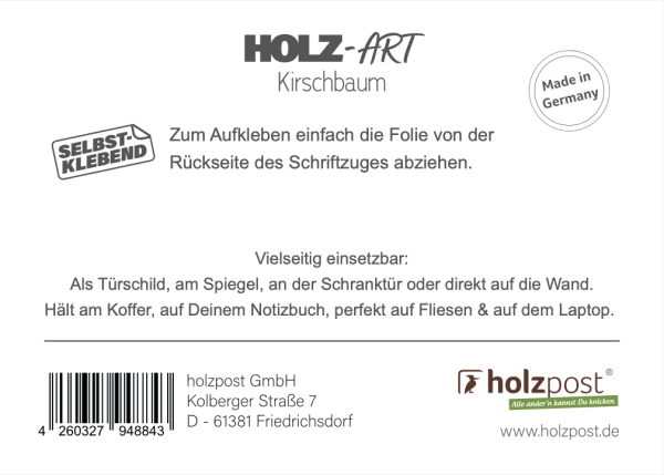 Das selbstklebende Holzschild besteht aus dünnem Kirschbaumholz.