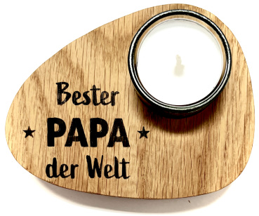 Der Teelichthalter von Holzpost® ist aus massivem Eichenholz gefertigt und mit dem Schriftzug "Bester Papa der Welt" und zwei Sternchen graviert.