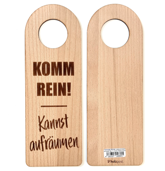 Der hochwertige Türanhänger von Holzpost® ist aus Buchenholz gefertigt und mit dem Schriftzug "Komm rein! - Kannst aufräumen" graviert.