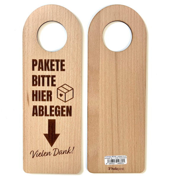 Der hochwertige Türanhänger von Holzpost® ist aus Buchenholz gefertigt und auf der einen Seite mit dem Schriftzug "PAKETE BITTE HIER ABLEGEN --> Vielen Dank!" graviert.