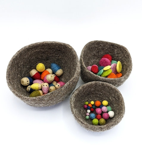 In diese drei unterschiedlich großen Filzschälchen von ROMANSWERK passen viele Kleinteile zum Beispiel aus den Villekulla Sets oder auch mindestens 100 Filzkugeln aus dem Farbenspiel.