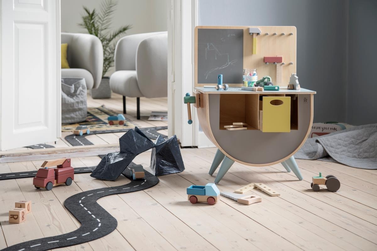 Diese außergewöhnliche Werkbank aus Holz von sebra in der Farbe warmgrau ist wirklich ein Blickfang - nicht nur im Kinderzimmer.