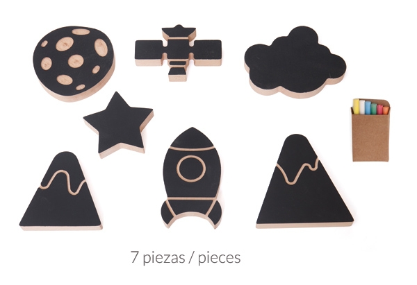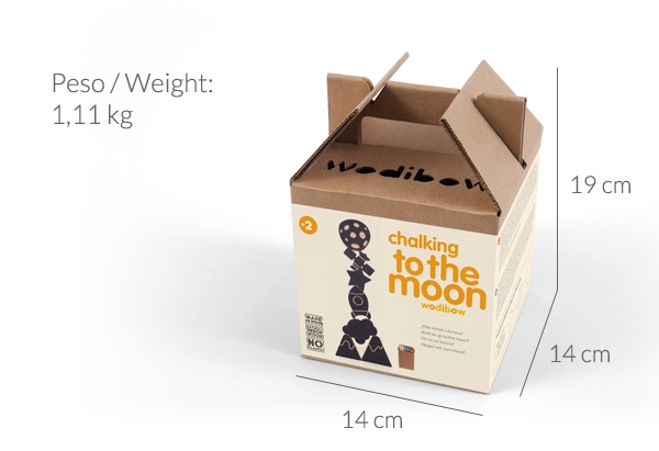 Geliefert wird Chalking to the Moon in einer hübschen Pappbox. Enthalten sind 7 Teile aus Buchenholz, auf einer Seite schwarz, auf der anderen weiß, damit man sie mit Kreide bemalen kann. Bunte Kreide ist auch mit dabei.
