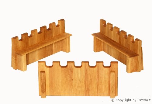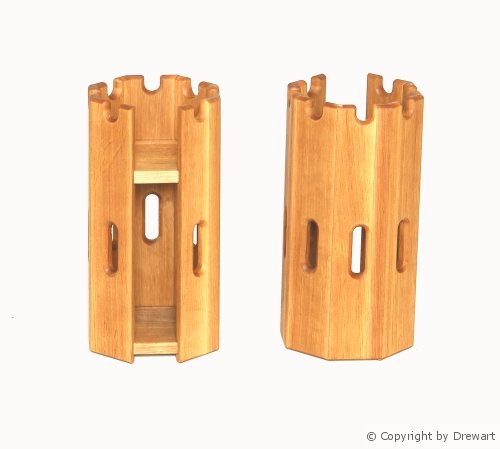 Die Burg ist aus massiver Erle gerfertigt, die mit Naturölen behandelt ist. Die roten Dächer des Kastells setzten sich vom warmen Erlenholz ab und bilden so einen schönen Kontrast. Die Ritterburgen von Drewart müssen nicht verschraubt werden! Die einzelnen Elemente der Burg, wie Mauern, Türme und Tor stehen stabil und sind daher kinderleicht aufzubauen. Sie sind zudem völlig variabel einsetzbar und könnten daher auch von zwei Kindern als Festungen genutzt werden.