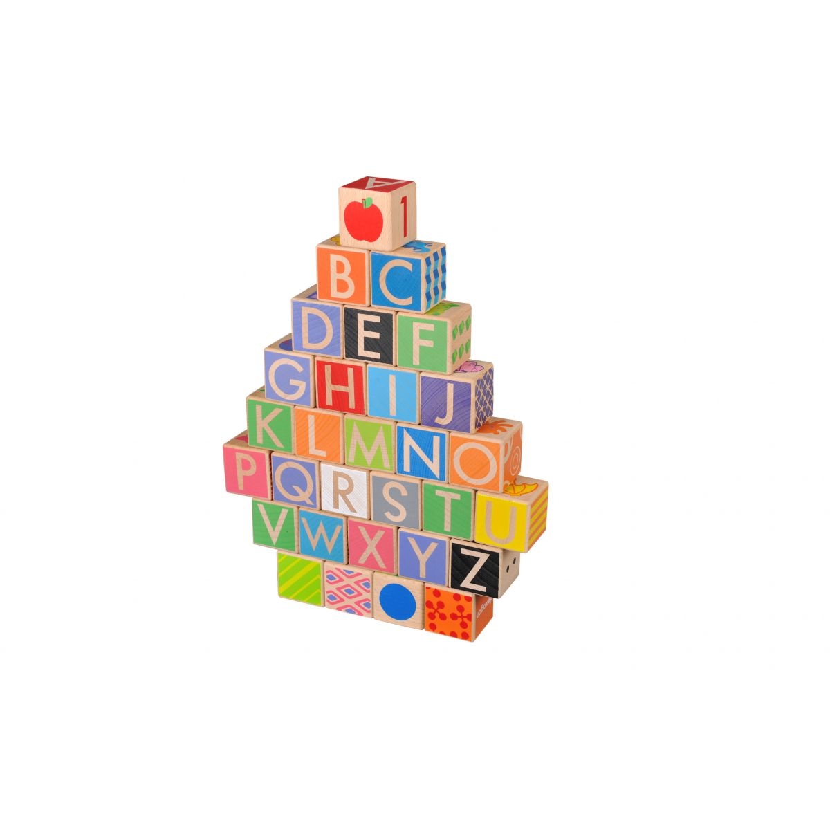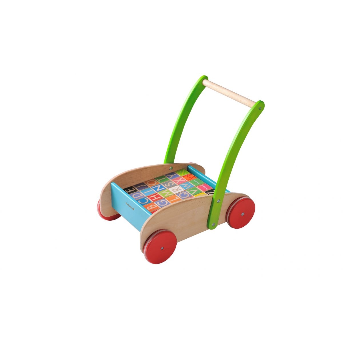 Der stabile Lauflernwagen aus Holz hat 30 Buchstabenwürfel im Gepäck, mit denen man spielen, bauen und lernen kann.