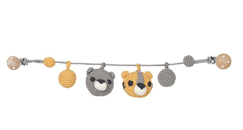 Die Kinderwagenkette mit Bär und Tiger wird in liebevoller Handarbeit gehäkelt und ist ein bezauberndes Spielzeug für das Baby.