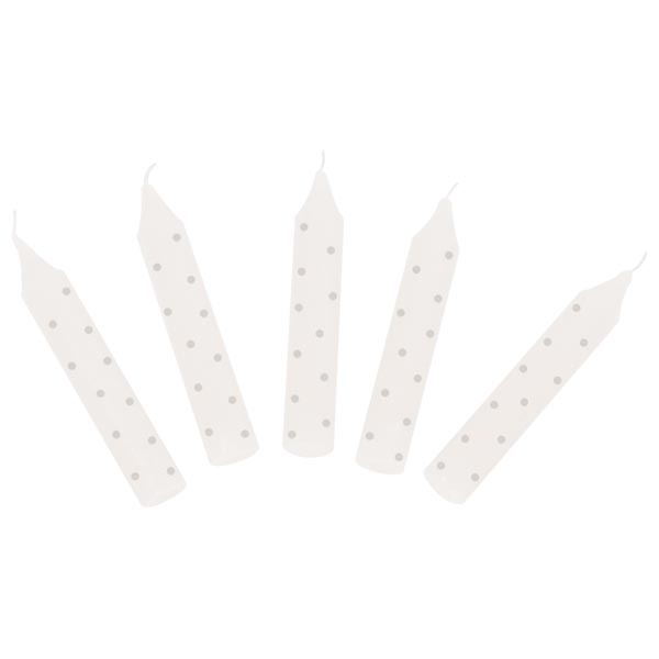 10 weiße Kerzen mit grauen Pünktchen im Set für die Geburtstagskränze, Geburtstagszüge und die anderen Geburtstagsdekorationen.