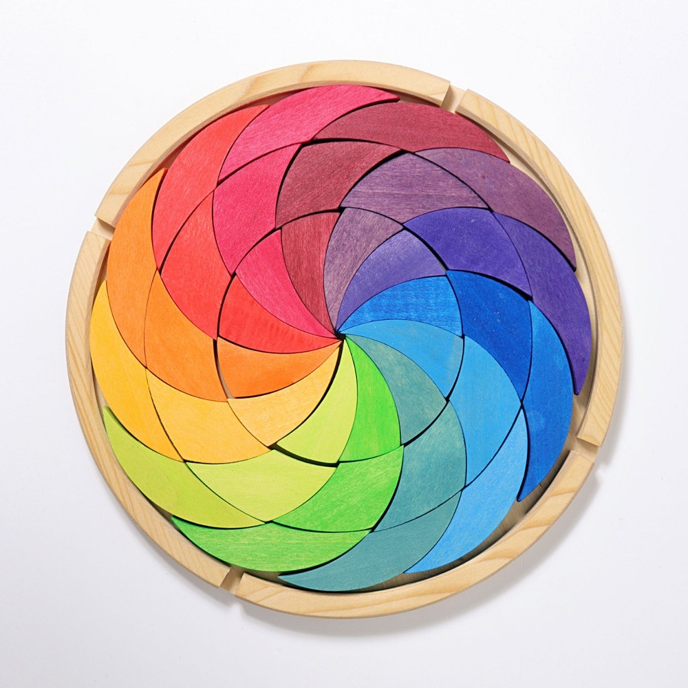 Mit dem kleinen Bauspiel Farbenrad in Regenbogenfarben können Mandalas gelegt werden. Man kann die Teile frei legen oder sie in den Rahmen hineinpuzzeln.