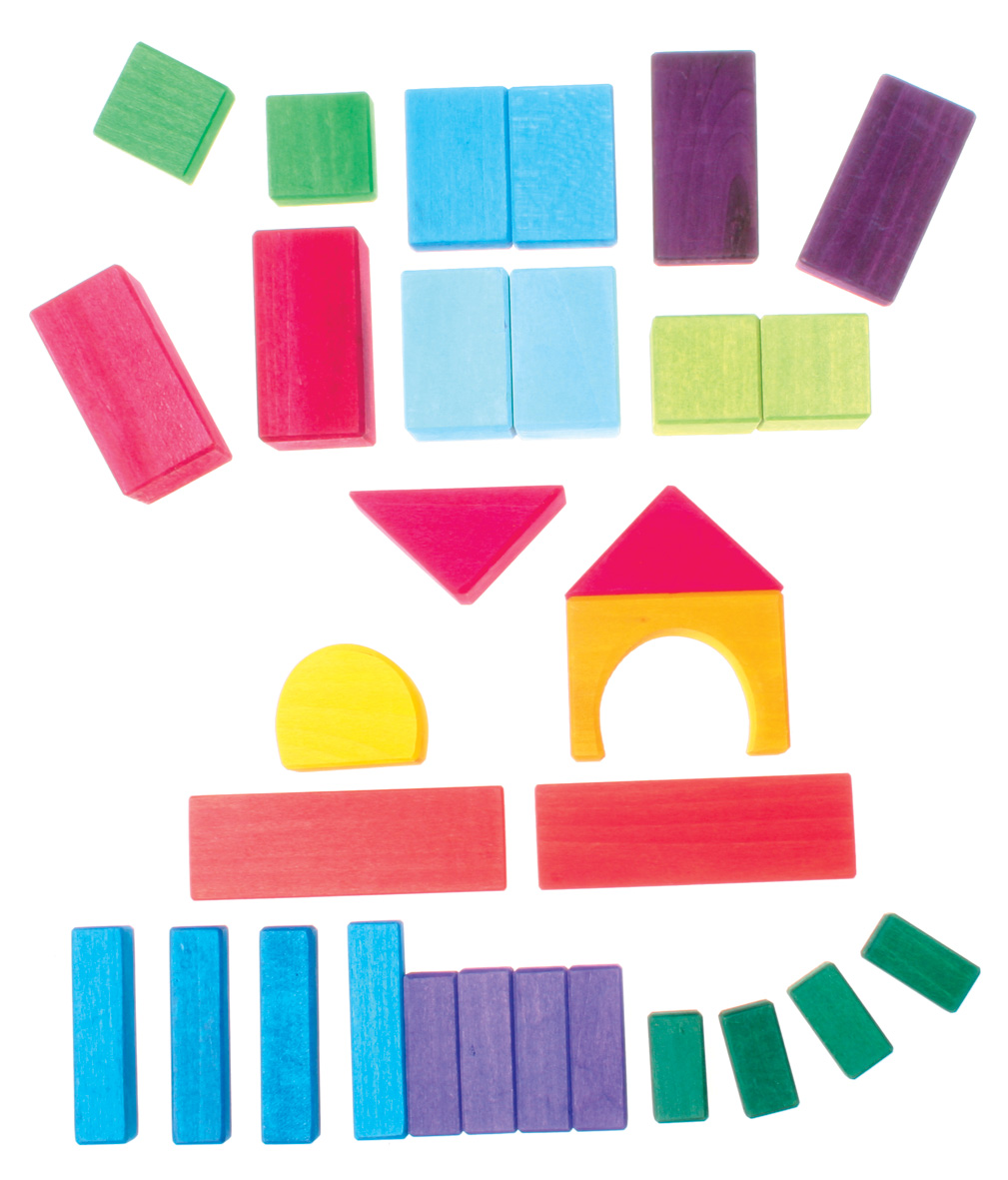Die Geo-Bauklötze von GRIMM´S sind in bunt oder natur erhältlich. Sie zeichen sich im Gegesatz zu den Waldorfklötzen durch ihre geometrischen, regelmäßigen Formen aus. Dennoch haben Geo-Bausteine und Waldofklötze vieles gemeinsam: sie weisen keinerlei scharfe Kanten auf, denn sie werden einzeln und von Hand geschliffen. Die natürlich-raue Oberfläche der Bausteine wird beibehalten, da sie nicht lackiert werden. So können sich auch keine Bakterien vermehren.