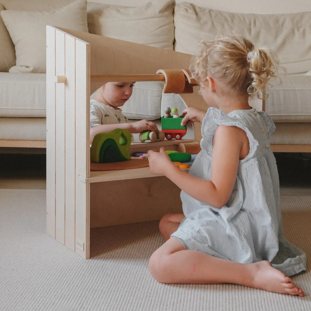 Durch sein robustes, naturbelassenes Material bietet es eine sichere Bühne für imaginative Geschichten und fördert spielerisch die Kreativität. Der Aufbau regt freies Spielen an: Kinder wählen Figuren, setzen Szenen zusammen und wechseln rollenspielend zwischen Charakteren und Situationen des Alltags, ganz unbekümmert von festen Lösungswegen.
