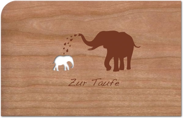 Ein großer Elefant, der das Elefantenbaby mit dem Rüssel beträufelt und der Schriftzug "Zur Taufe" sind das Motiv dieser niedlichen Holzkarte.