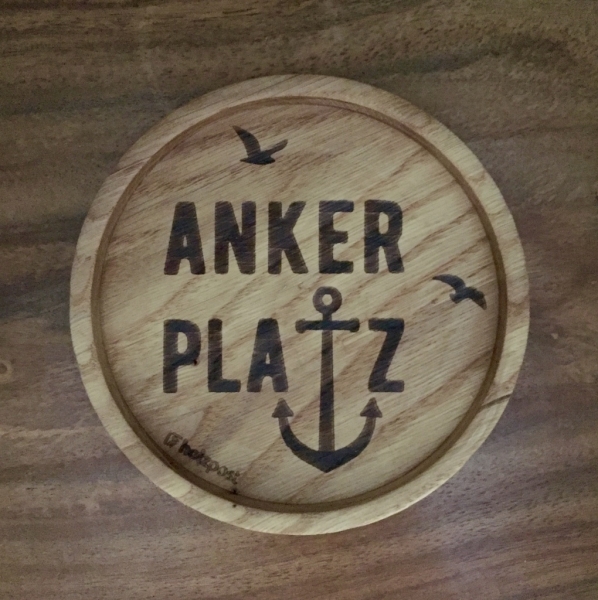 Der runde Untersetzer von Holzpost® ist aus massivem Eichenholz gefertigt und mit dem Schriftzug "Ankerplatz" graviert.