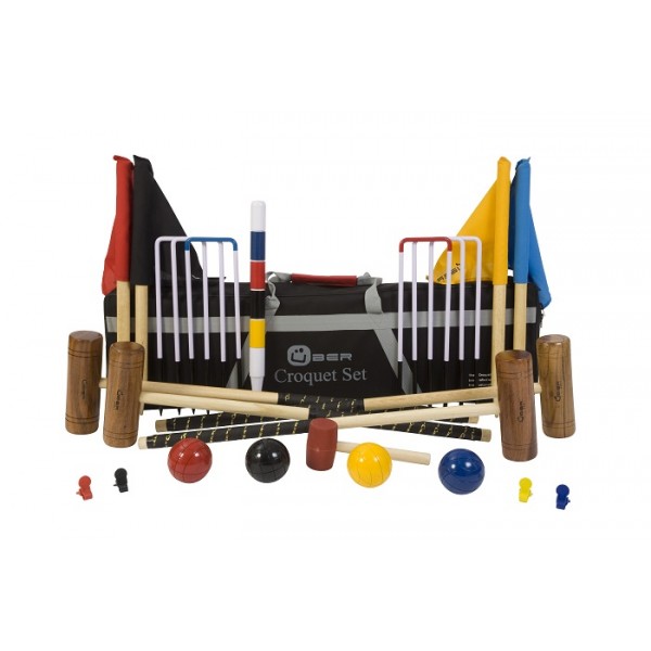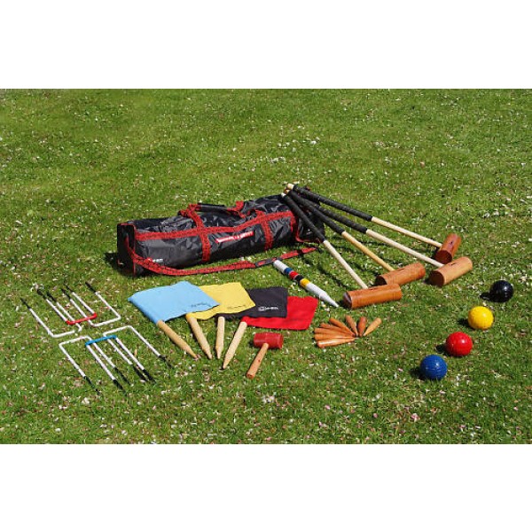 Das Garten Krocket Set von Übergames ist ein Krocket-Spiel für Einsteiger von qualitativ hoher Verarbeitung. Das Spiel ist optimal auch für Erwachsene geeignet. Zwei unterschiedliche Schlägerlängen zeichnen das Set aus. Die vier Schläger aus Hartholz sind mit Lederbändern umwickelt. Auch die traditionell hölzernen Krocketbälle zeichen sich durch hohe Qualität aus.