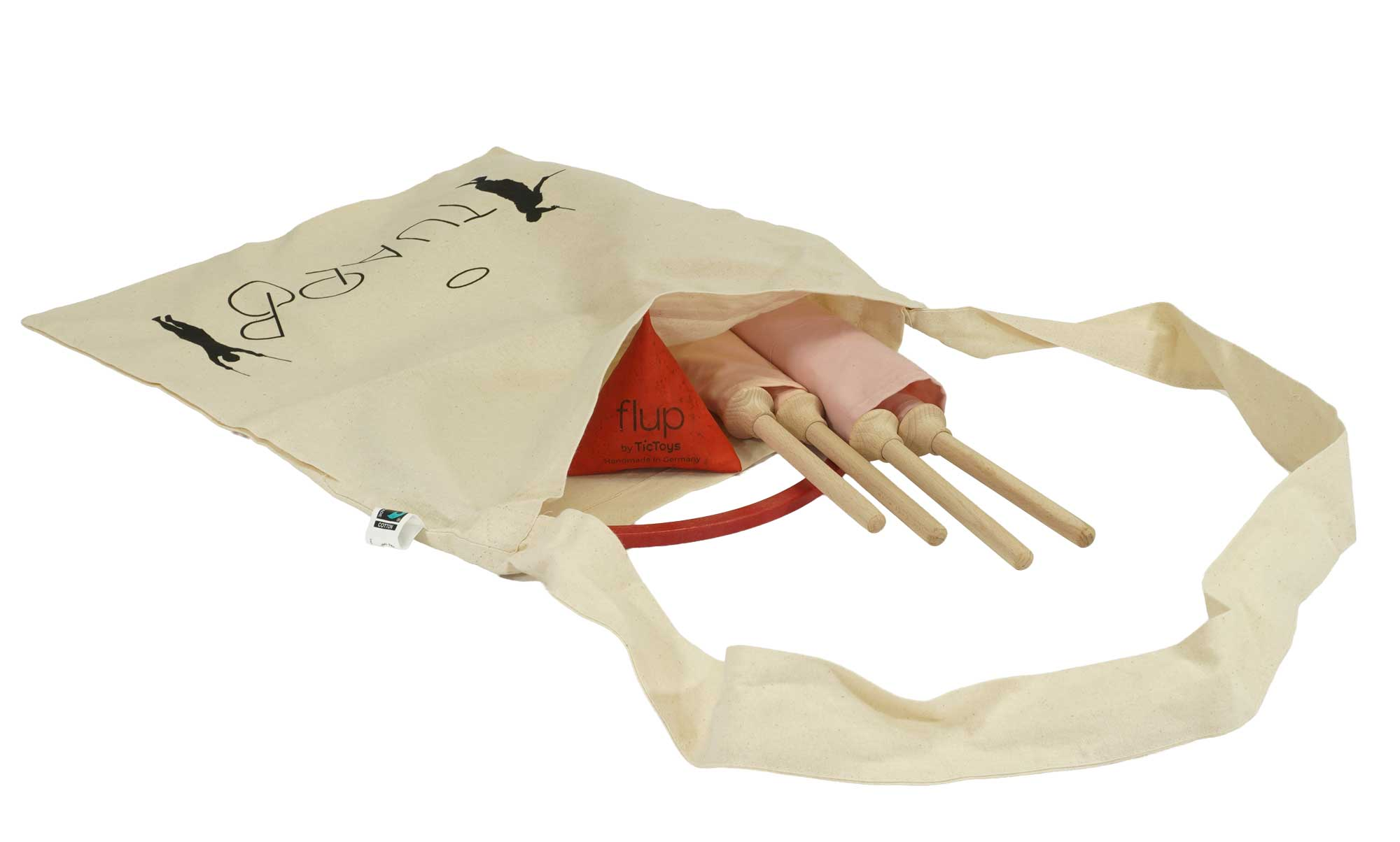 Ein Tualoop & flup - Set für 2 Spieler enthält zwei Paar Sticks, einen Tualoop Ring, ein Wurfsäckchen flup bag, zwei flub fab in Mango und Apricot, eine Tragetasche aus Baumwolle und je eine Spielanleitung für flup und für Tualoop.