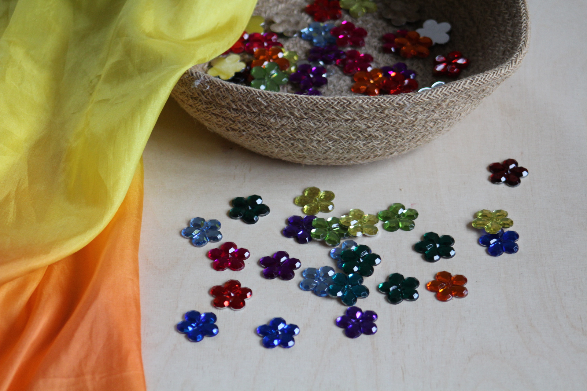 Die Funkelsteine in Blumenform verschönern jeden Geburtstagstisch. Auch beim kreativen Legen von Formen, Figuren, Mandalas und vielem mehr sind die Glitzersteine aus Acryl gern gesehen.
