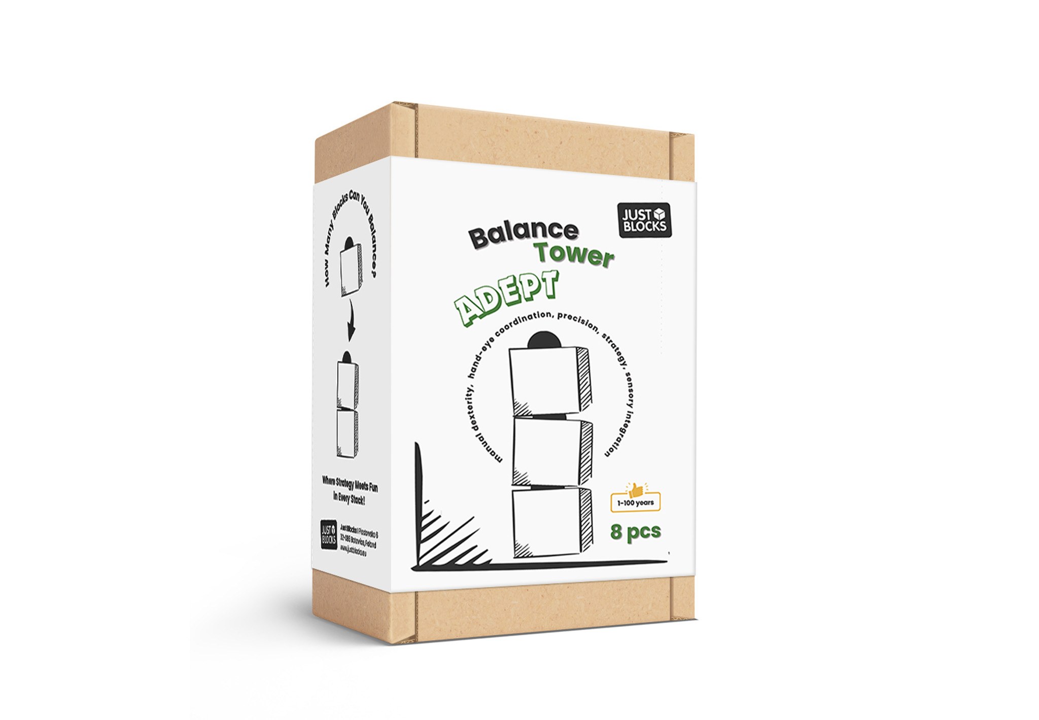 Der JUST BLOCKS Balance Tower ADEPT ist ein Holzspielzeug für Klein & Groß, Jung & Alt mit 8 Teilen!