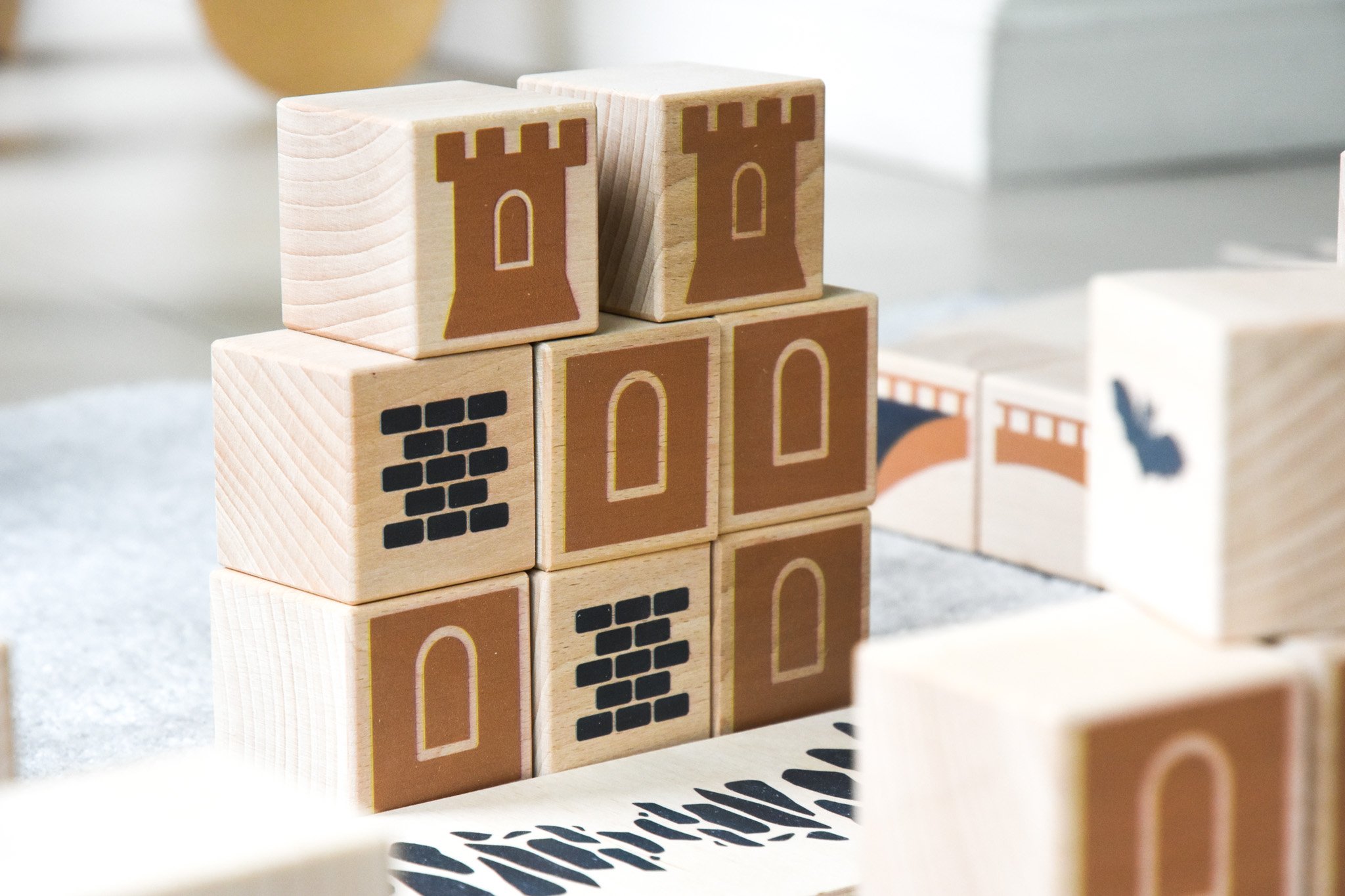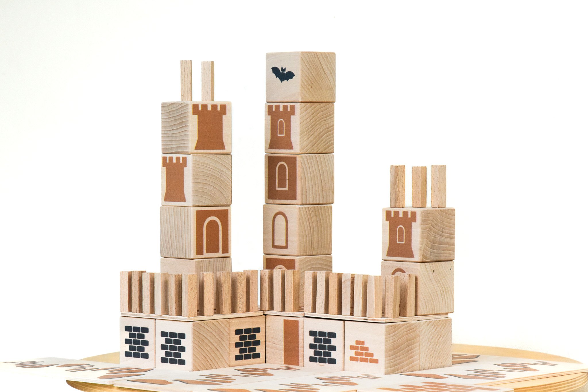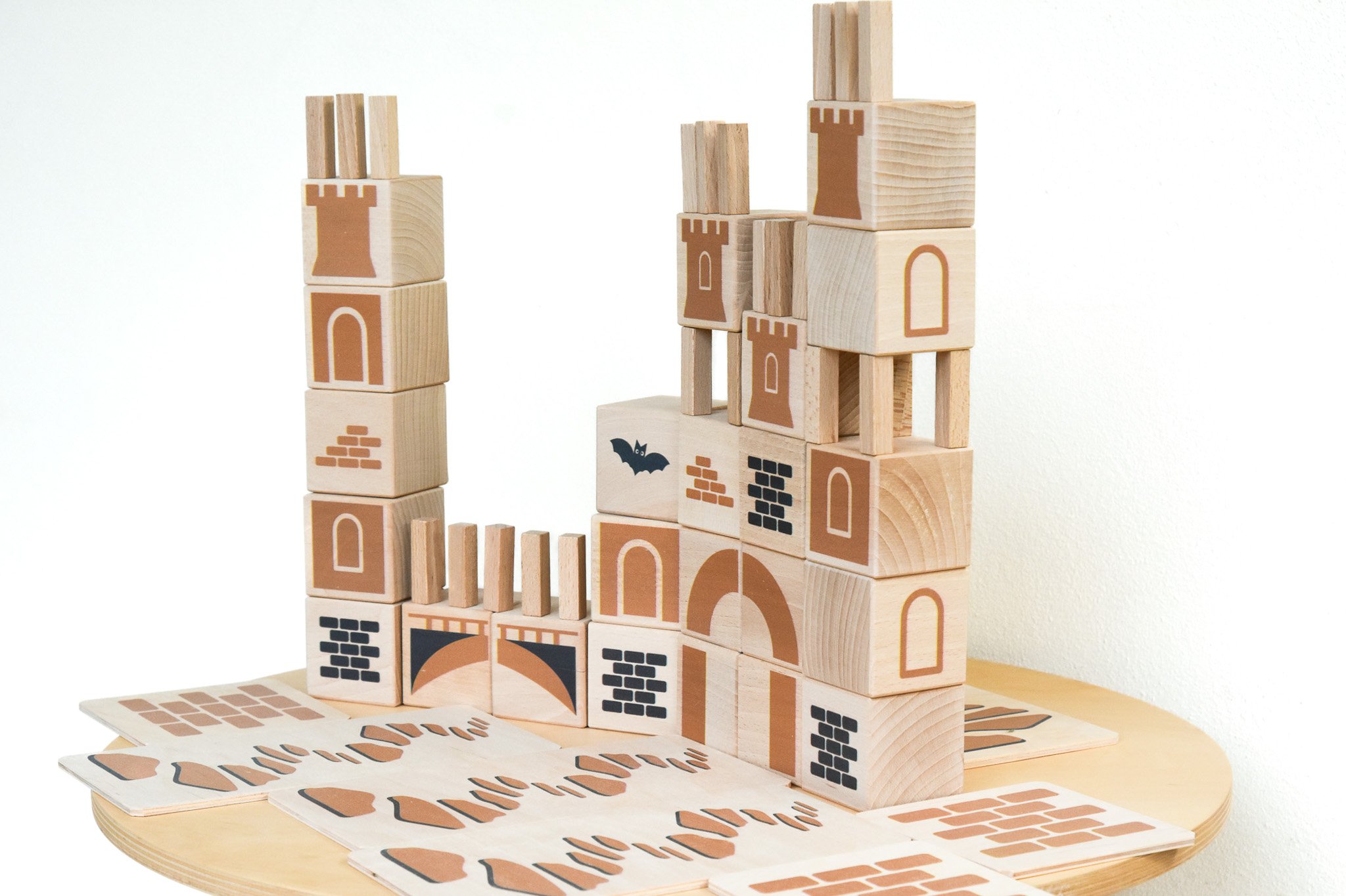 Die Castle Box besteht aus vier unterscheidlichen Bausteinen. Sie sind in sanften Farben dezent bedruckt, so dass den Kindern zwar Ideen auf den Weg gegeben werden, sie aber dennoch frei spielen können. Der Druck befindet sich nur auf jeweils einer Seite, so können die Castle Bausteine auch in alle anderen Welten verbaut werden. Die dezenten Grafiken auf den Holzbausteinen zeigen zum Beispiel Mauern, Fensterläden, Burgtürme oder Elemente des Burgtors, es gibt auch angedeutete Steinwege, wie sie im Mittelalter üblich waren.