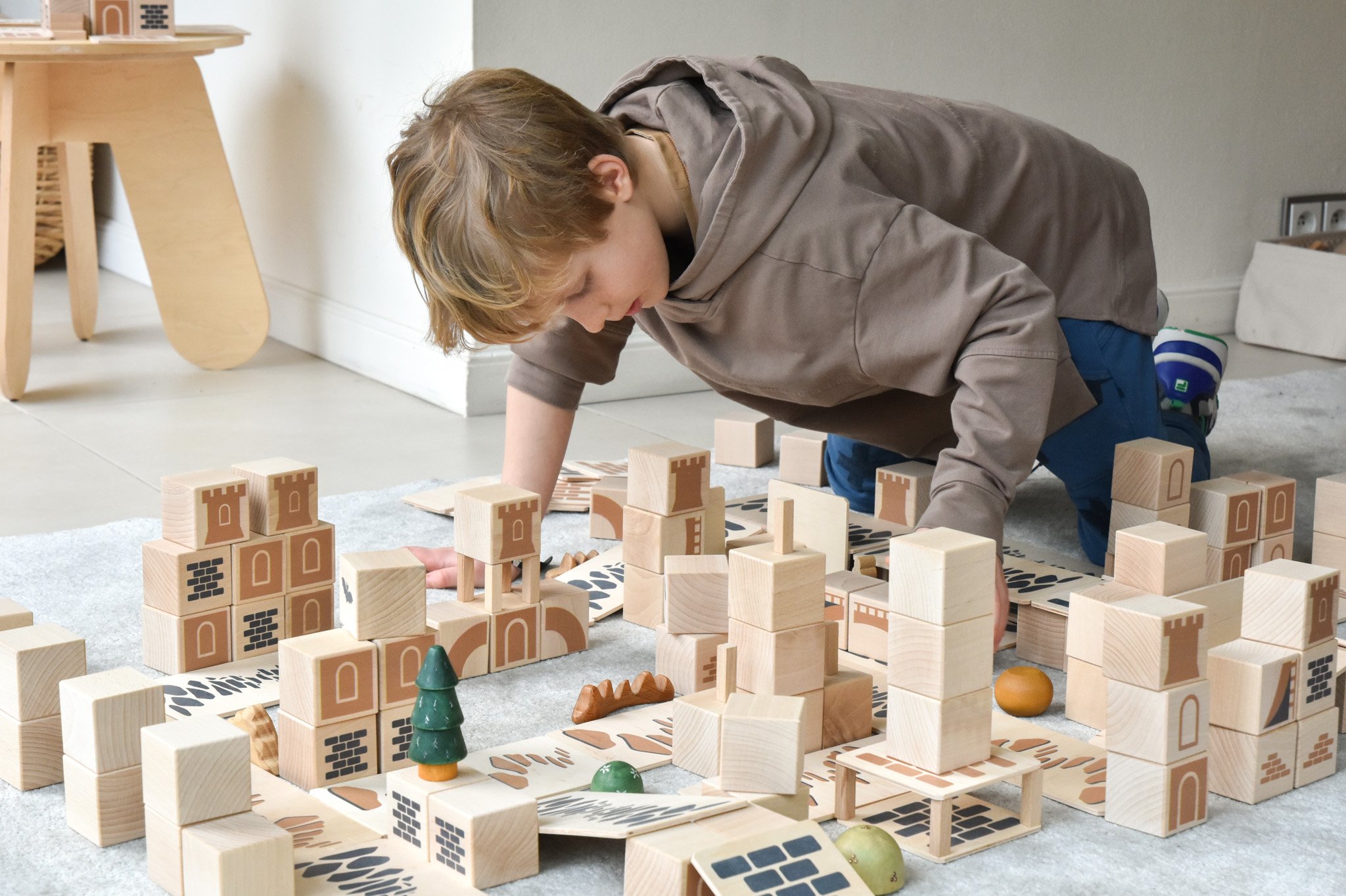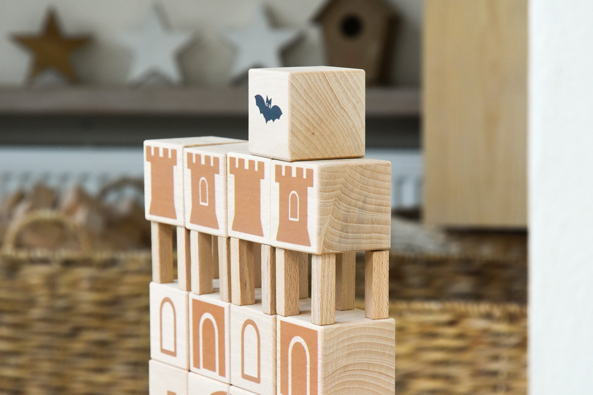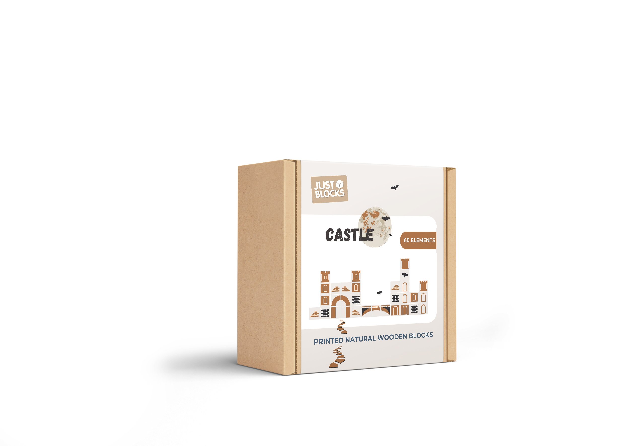 Die Castle Box besteht aus vier unterscheidlichen Bausteinen. Sie sind in sanften Farben dezent bedruckt, so dass den Kindern zwar Ideen auf den Weg gegeben werden, sie aber dennoch frei spielen können. Der Druck befindet sich nur auf jeweils einer Seite, so können die Castle Bausteine auch in alle anderen Welten verbaut werden. Die dezenten Grafiken auf den Holzbausteinen zeigen zum Beispiel Mauern, Fensterläden, Burgtürme oder Elemente des Burgtors, es gibt auch angedeutete Steinwege, wie sie im Mittelalter üblich waren.