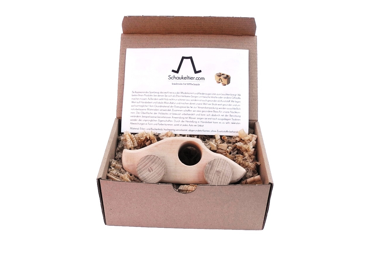 Verpackt sind die Holzautos in einem minimalistischen Karton. Eine kleine Broschüre über Schaukeltier liegt dabei. Selbst die Verpackung besteht komplett aus recycelbaren Materialien. Nur original mit dem Schaukeltier-Brandzeichen!