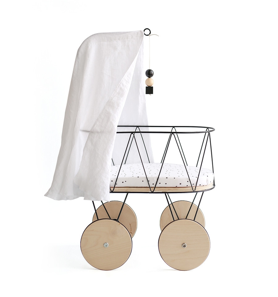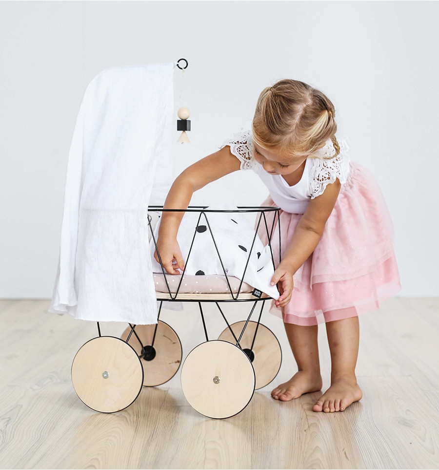 Wunderbar passt der Betthimmel zum minimalistischen Design des Puppenbetts, dssen Stange ebenfalls aus Metall mit Details aus Holz besteht.