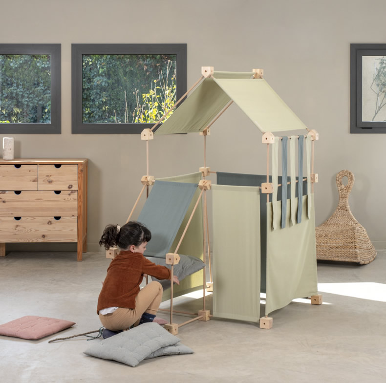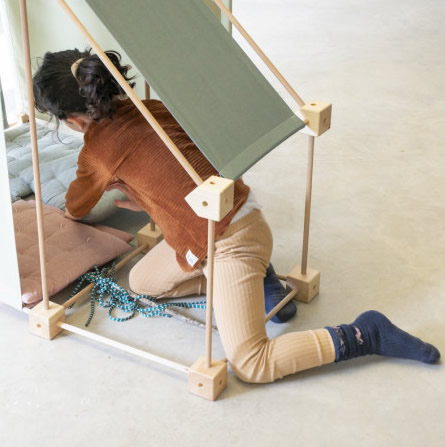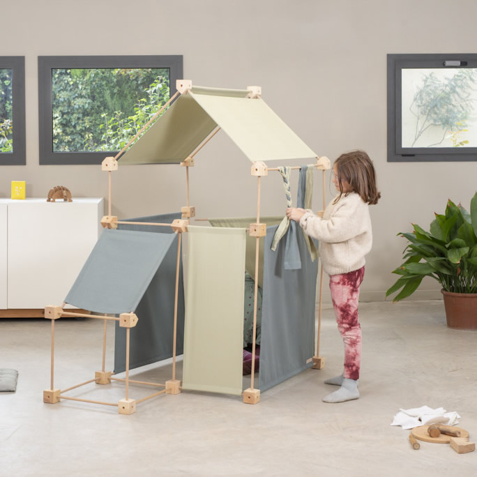 Das Baukastenspiel ist einfach erklärt: Es geht darum, die Vierkant- und Winkelklötzchen mit den Leisten zu verbinden. Hierbei sind nur bestimmte Verbindungen erlaubt, was zum Nachdenken anregen soll. Werden die Leisten dann noch mit den Stoffstücken kombiniert, lassen sich die tollsten Gebilde bauen!