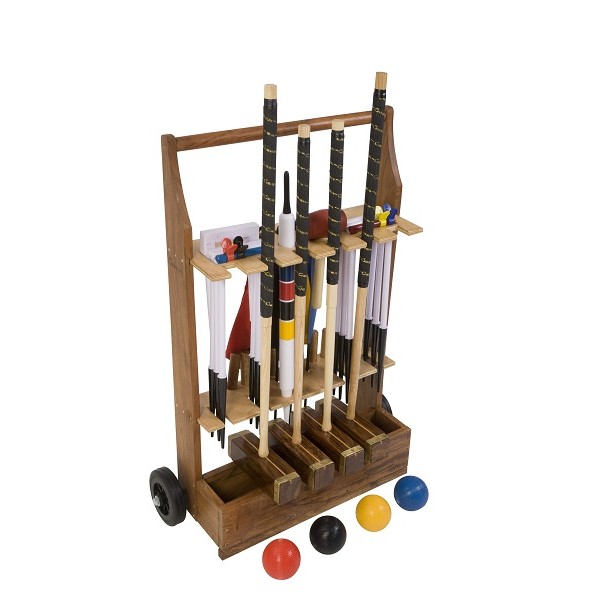 Die sechs Schläger sind mit Lederbändern umwickelt. Der eckige Kopf ist mit einem Messingschutz gefertigt. Die achteckigen Stiele der Krocketschläger bestehen aus Esche. Statt Holzkugeln werden bei diesem Krocketspiel jedoch Krocketbälle aus Composite geliefert. Dieses Material wird bei Bällen von Profi Krocketspielen verwendet, da diese eine längere Haltbarkeit aufweisen, als die traditionellen Holzbälle.
