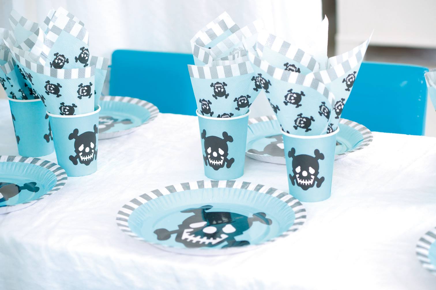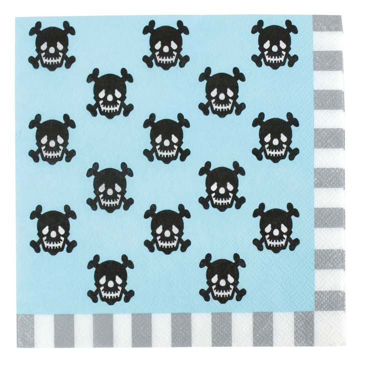 Mit den hellblauen Servietten aus Papier mit dem Piratenkopf zaubern Sie im Handumdrehen eine coole Party-Deko für einen Kindergeburtstag kleiner Seeräuber-Fans.