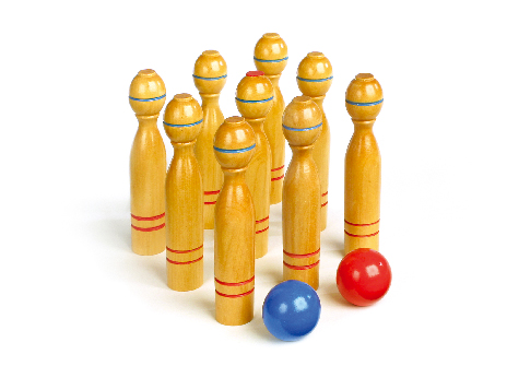 Bei diesem Kegelspiel sollen die neun klassischen Holzkegel mit den Holzkugeln umgekegelt werden. Höhe der Kegel ca. 17 cm, Durchmesser der Kegel ca. 3 cm. Durchmesser der Kugeln: ca. 4,5 cm.