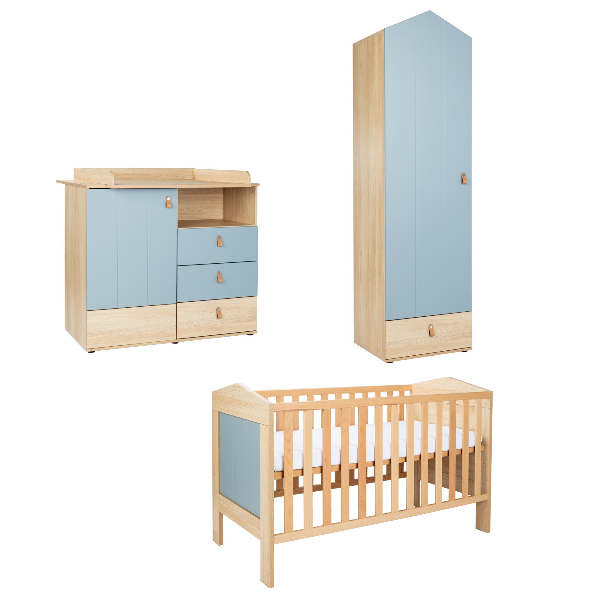 Neben der geräumigen Wickelkommode bietet dieses 3-teilige Babyzimmer ROOFY außerdem ein Babybett, das durch optional bestellbare Umbauseiten später zu einem gemütlichen Juniorbett verwandelt werden kann und einen kompakten 1-türigen Kleiderschrank.