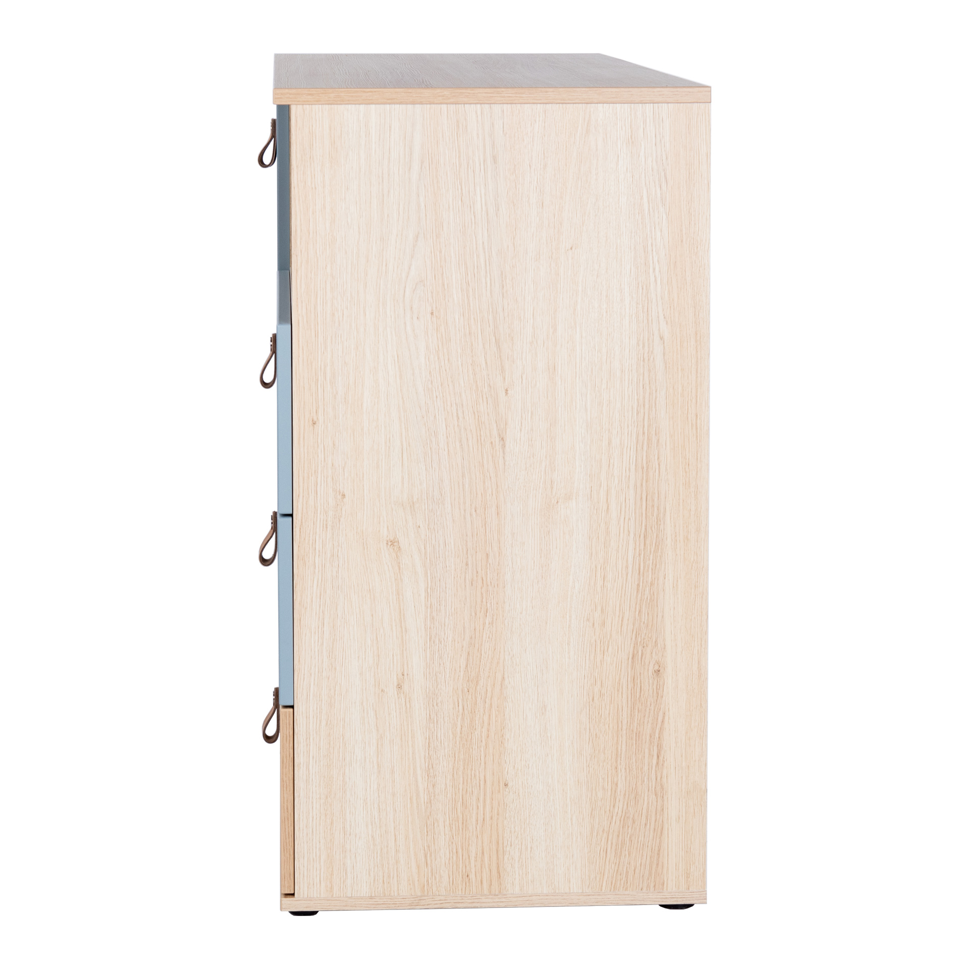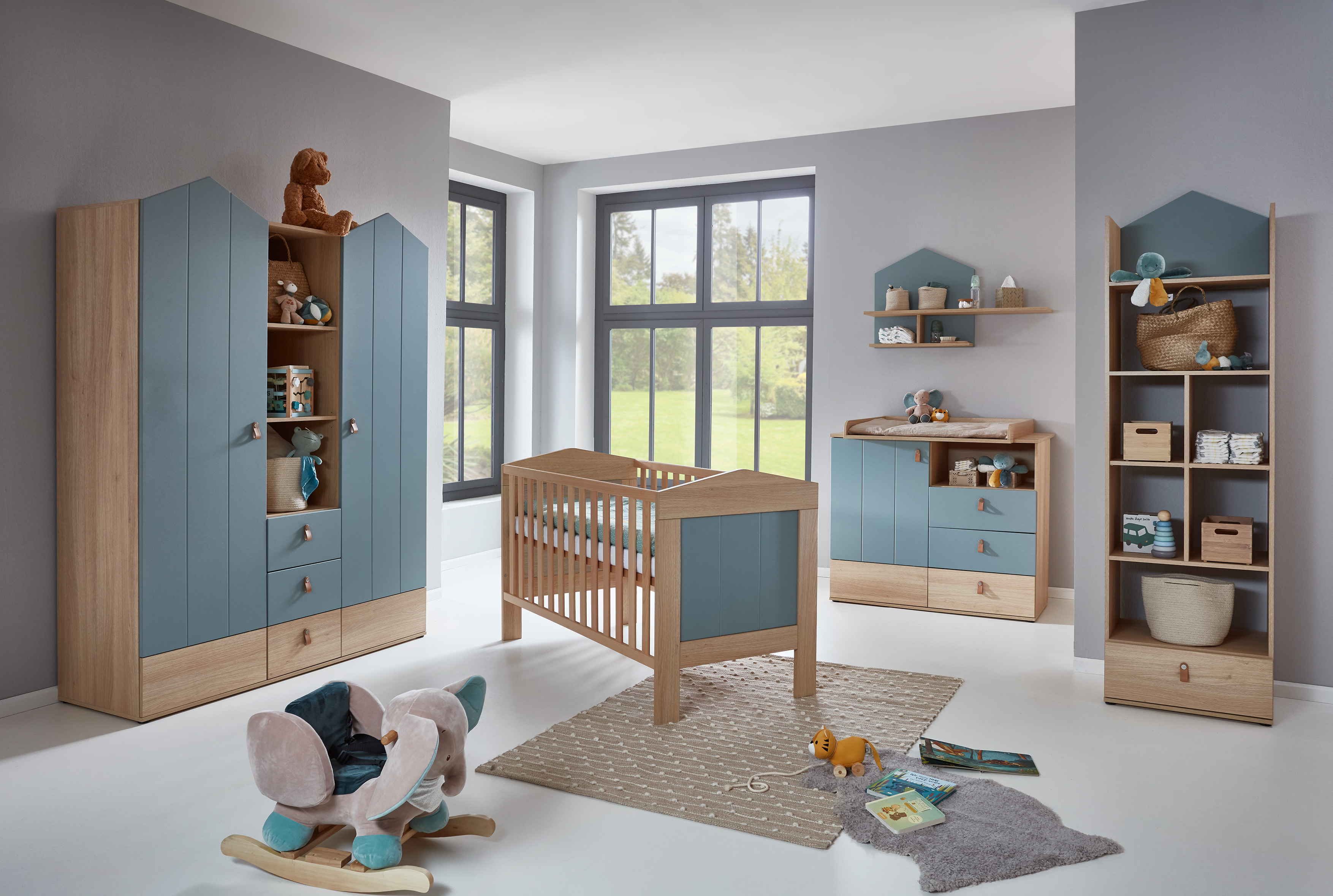 Das Spitzdach-Design gepaart mit der Rillenfräsung und dem harmonischen Salbei erinnern an Strandhäuser und Leichtigkeit. Die warme Nagano-Oak-Nachbildung in Kombination mit dem Salbei steht für einen zeitlosen, modernen Look mit dem besonderen Etwas. Ein Hingucker sind die Schlaufen-Griffe aus Leder. Sie sorgen für einen komfortablen Griff und setzen zudem tolle weitere optische Akzente. Die verdeckte Verschraubung am Kinderbett sorgt für Stabilität und garantiert außerdem ein ansprechendes Design. Selbstverständlich sind alles Schubladen und Türen gedämpft, so dass ein leiese Öffnen und Schließen möglich ist. So wird das Babyzimmer ROOFY zu einem ganz besonderen Wohlfühlort.