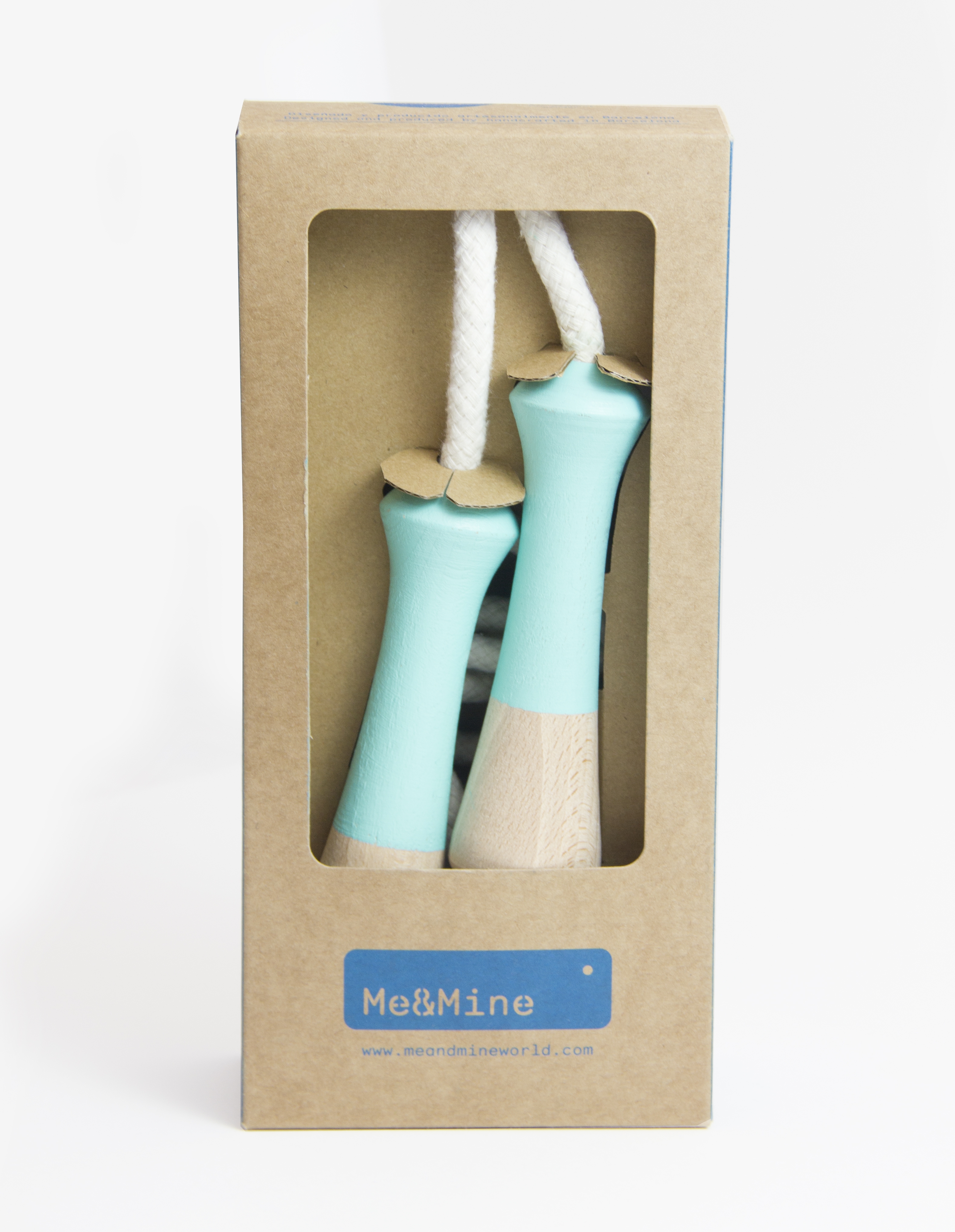 Das Springseil besteht aus Buchenholz und einem Baumwollseil. Es ist teils naturfarben, teils farbig lackiert.