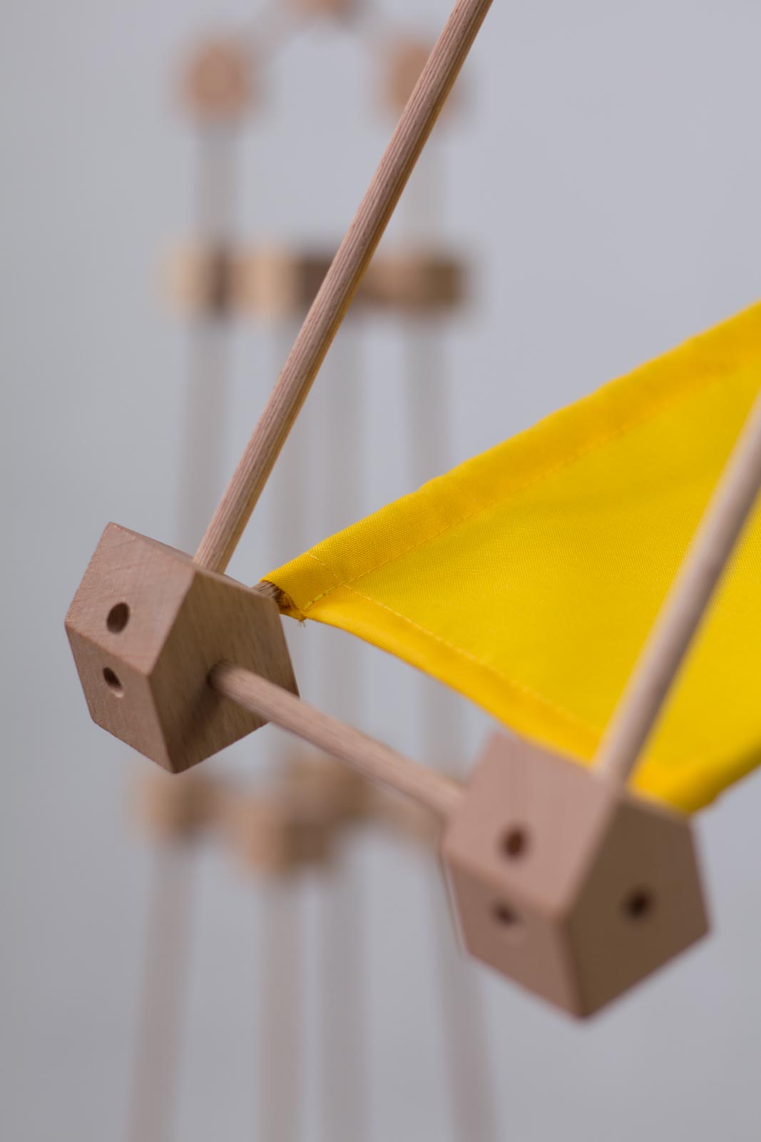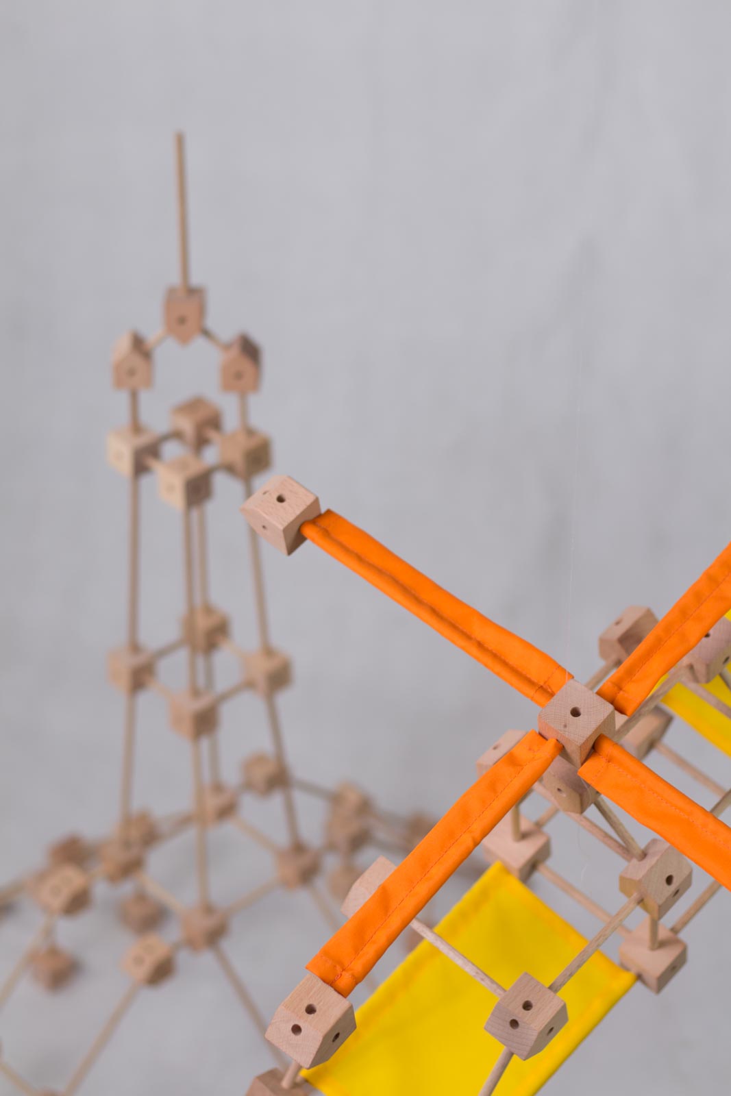 Das Baukastenspiel ist einfach erklärt: Es geht darum, die Vierkant- und Winkelklötzchen mit den Leisten zu verbinden. Hierbei sind nur bestimmte Verbindungen erlaubt, was zum Nachdenken anregen soll. Werden die Leisten dann noch mit den Stoffstücken kombiniert, lassen sich die tollsten Gebilde bauen!