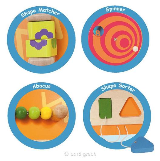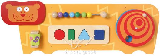 Die Wandtafel Löwe besteht aus einem Abakus mit 6 Kugeln, die man hin und her schieben kann. Eine Spirale zum Drehen, hinter deren Öffnung sich Zahlen verstecken, ein Formen-Steckspiel und zwei Scheiben, auf denen je ein Teil einer Blume abgebildet ist, die wieder zusammengesetzt werden soll, runden die Spielmöglichkeiten ab.