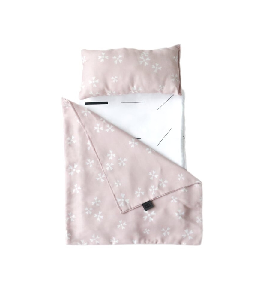 Diese 3-teilige hochwertige, rosa-weiße Puppenwagen Wäsche Blushing Blossoms mit weißen Blüten auf rosa Untergrund ist vom zauberhaften Design Label ooh noo.