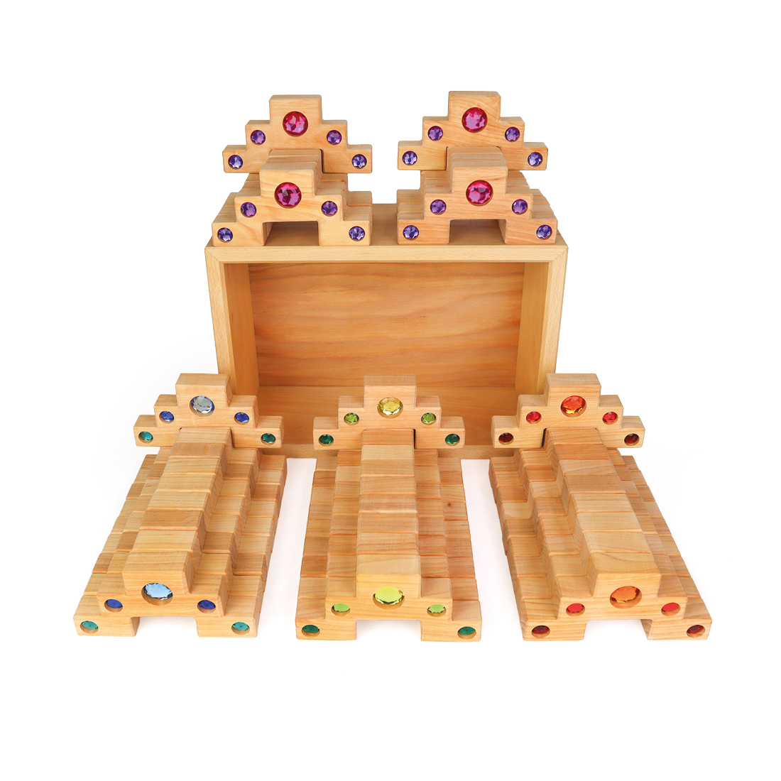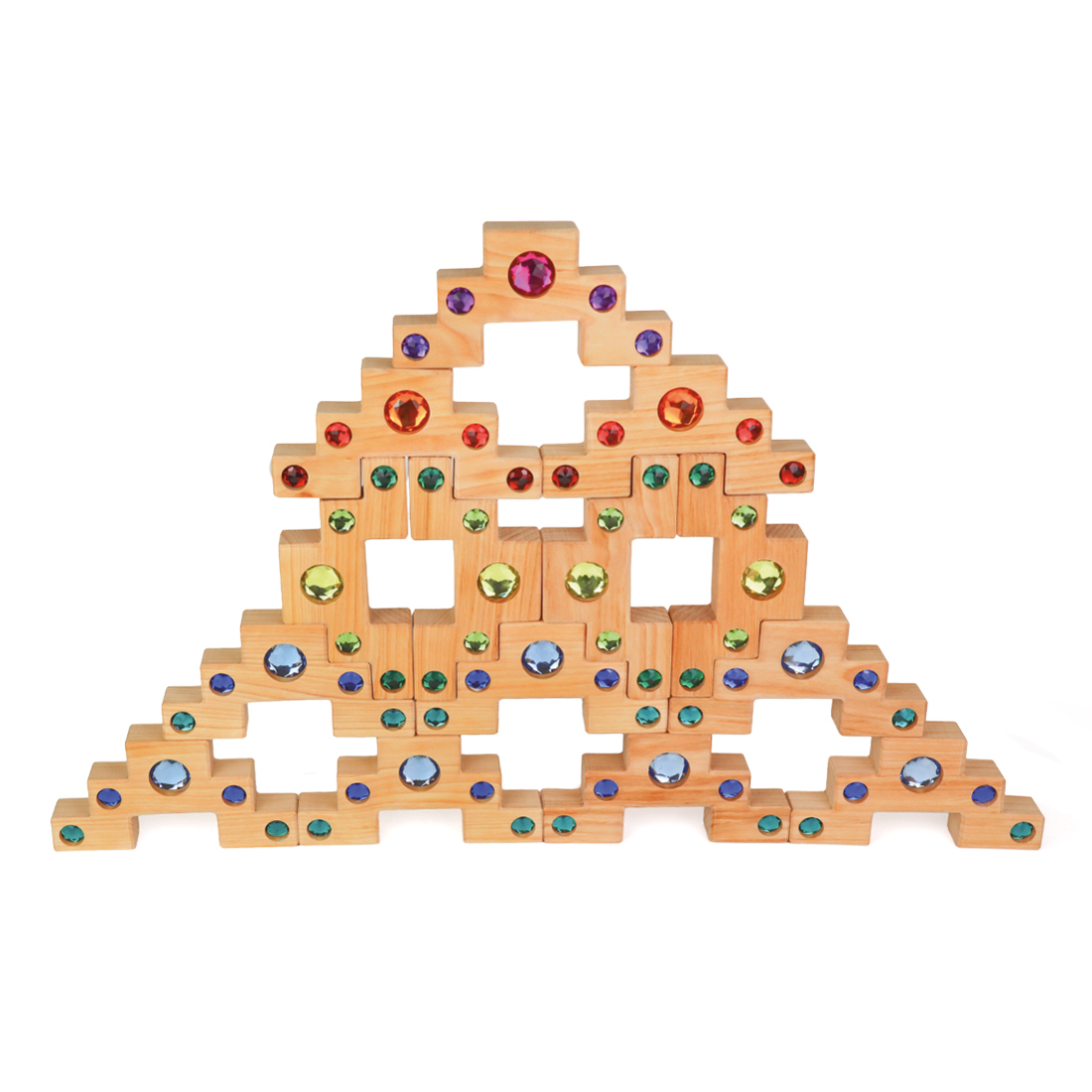Dieses schöne Set enthält 40 naturfarbene Bauklötze in Treppenform mit Funkelsteinen (je zehn Farbtreppen in vier Farben) in einem Holzrahmen.