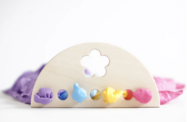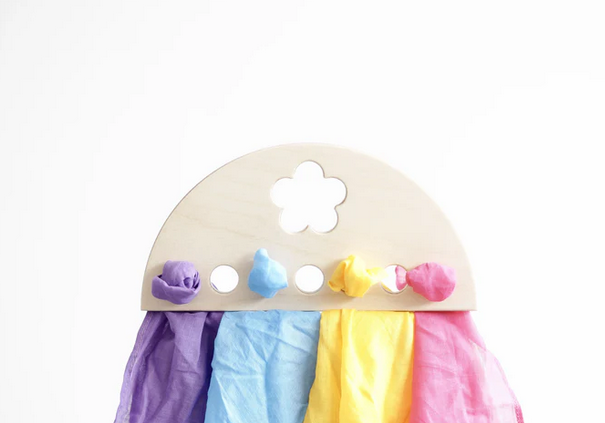 Das kleine Display Flower von LAURA´S PLAY COTTON hat sieben Löcher, in die man die bunten Spieltücher stecken und sie somit wunderbar aufbewahren kann.