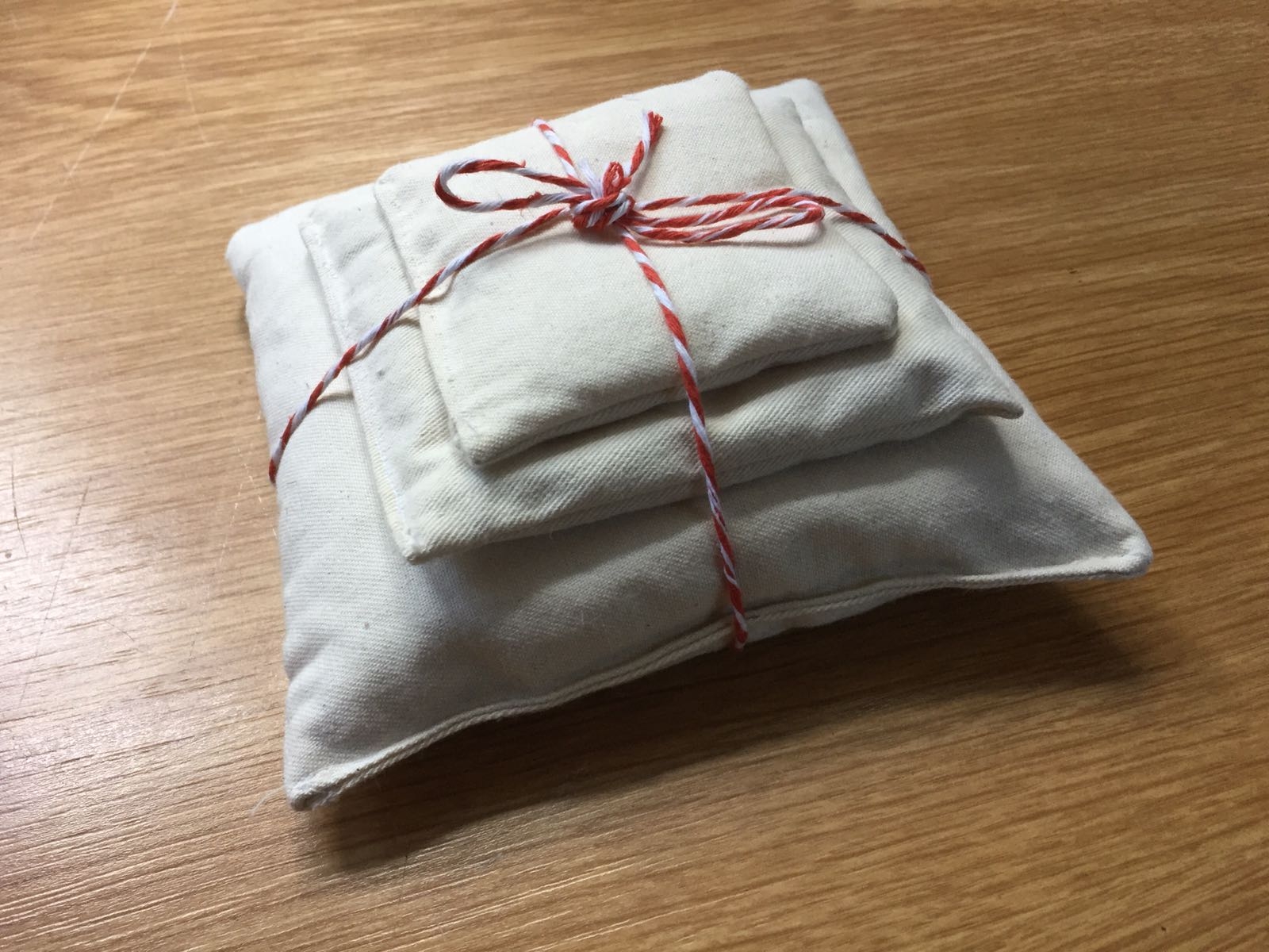 Das Set besteht aus 3 kleinen, unterschiedlich gefüllten Säckchen (Kirschkern, Sand und Steinchen) aus Baumwolle.