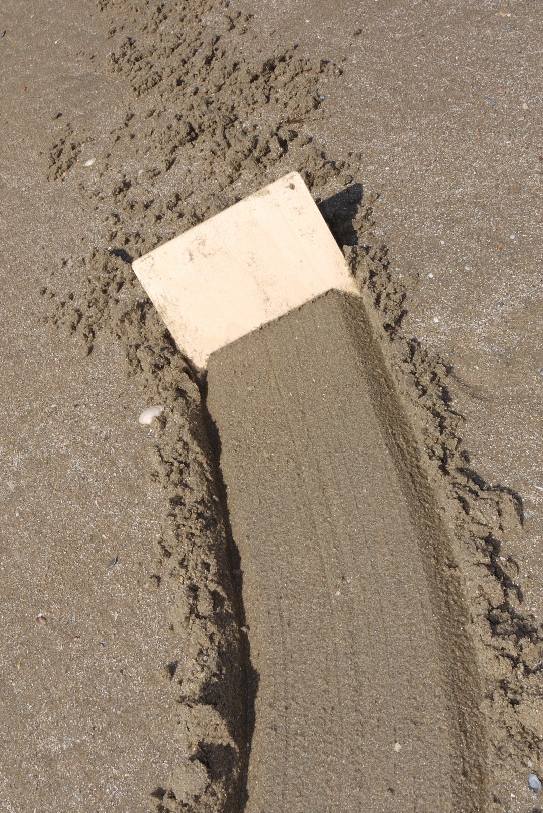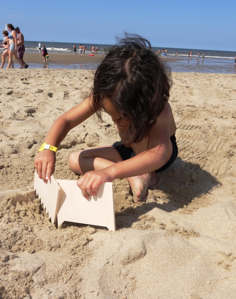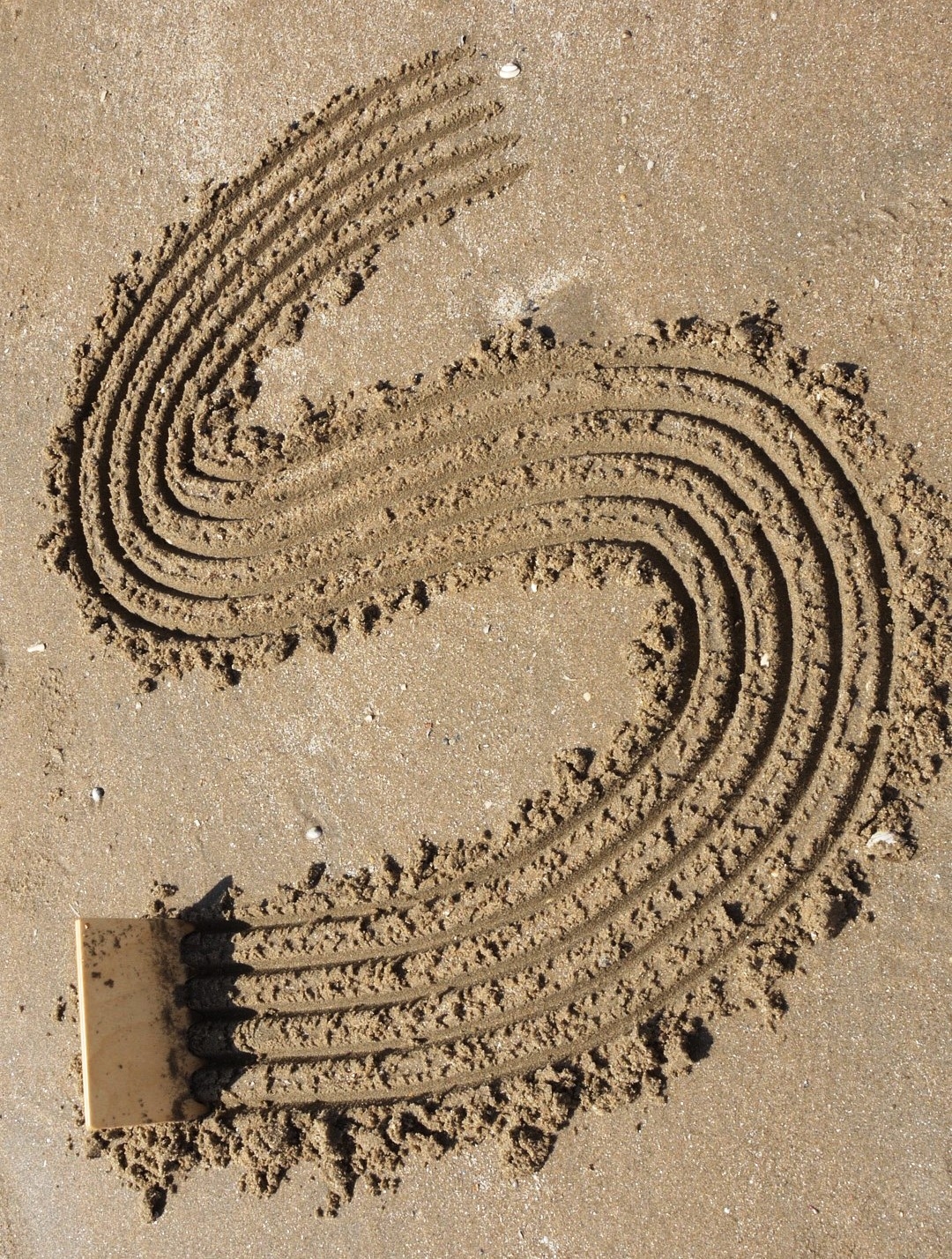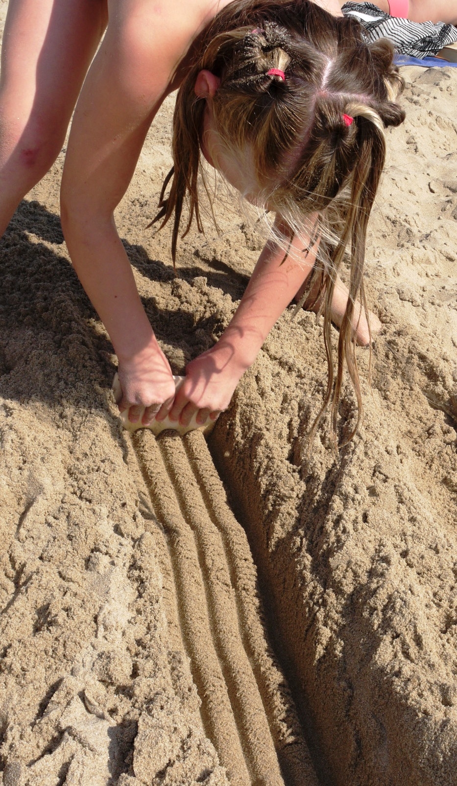 Während die Kleinen Gräben, Straßen, Wege, ein Flussbett oder etwas ganz anderes damit schaffen, können sich die Großen an Mustern versuchen oder einfach nur gedankenverloren den Holzkamm durch den Sand ziehen.