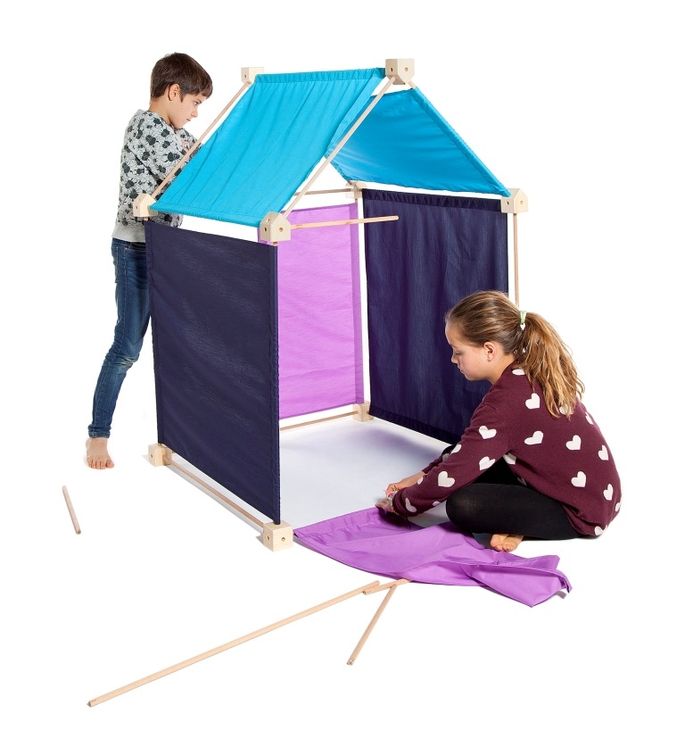 Das Baukastenspiel ist einfach erklärt: Es geht darum, die Vierkant- und Winkelklötzchen mit den Leisten zu verbinden. Hierbei sind nur bestimmte Verbindungen erlaubt, was zum Nachdenken anregen soll. Werden die Leisten dann noch mit den Stoffstücken kombiniert, lassen sich die tollsten Gebilde bauen!