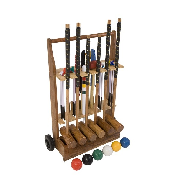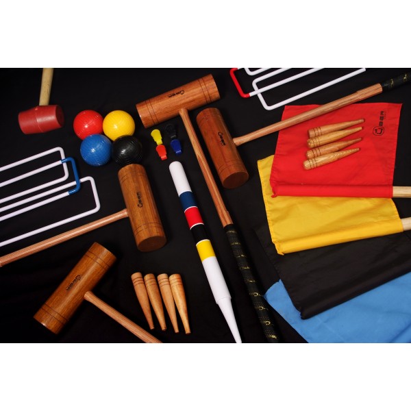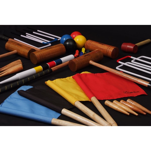 Die sechs Schläger sind mit Lederbändern umwickelt und aus Hartholz gefertigt. Statt Holzkugeln werden bei diesem Krocketspiel jedoch Krocketbälle aus Composite geliefert. Dieses Material wird bei Bällen von Profi Krocketspielen verwendet, da diese eine längere Haltbarkeit aufweisen, als die traditionellen Holzbälle.
