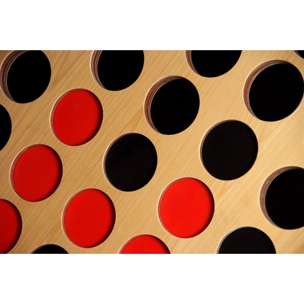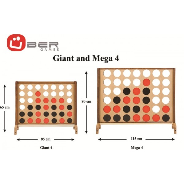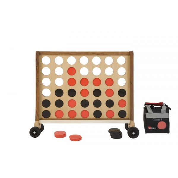 Das XXXL Giga 4 in einer Reihe von Übergames besteht aus hochwertigen Materialien. Der Spielrahmen ist auch englischem Erlensperrholz, die Beine und die Bodenplatte sind aus Mangoholz gefertigt. Die Bodenplatte ist abnehmbar, damit man die Spielsteine einfach entnehmen kann. Die 42 Spielsteine aus Kunststoff in rot und schwarz können in der praktischen Stofftasche aufbewahrt werden. Die abgebildeten Räder sind nicht im Lieferumfang enthalten!